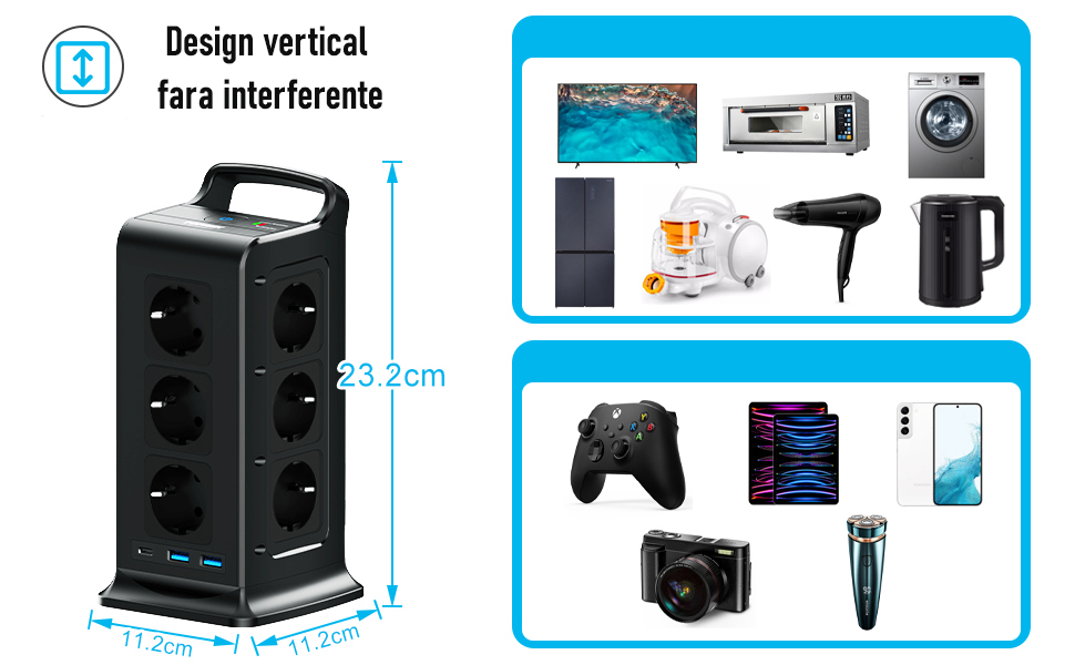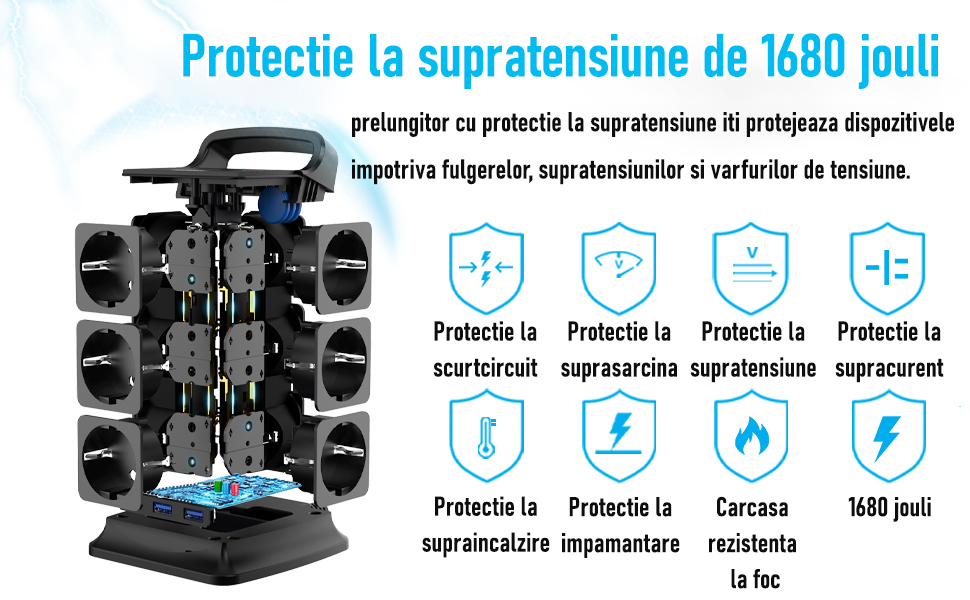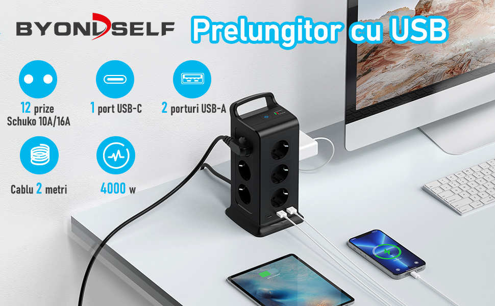 Prelungitor Tip Turn, BYONDSELF®, 4000W, 2xUSB/1xType-C PD20W/12xPrize, Protectie Supratensiune, Cordon 2m, Negru