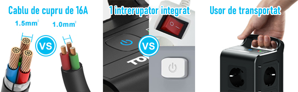 Prelungitor 4000W, 3 Prize/2 USB-A/1 USB-C, BYONDSELF®, 3 Intrerupator Individuel, Priza multipla Murale, Alb