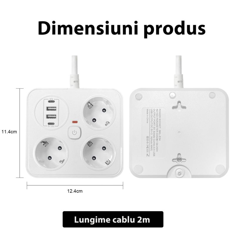 Prelungitor 4000W, 3 Prize/2 USB-A/1 USB-C, BYONDSELF®, 3 Intrerupator Individuel, Priza multipla Murale, Alb