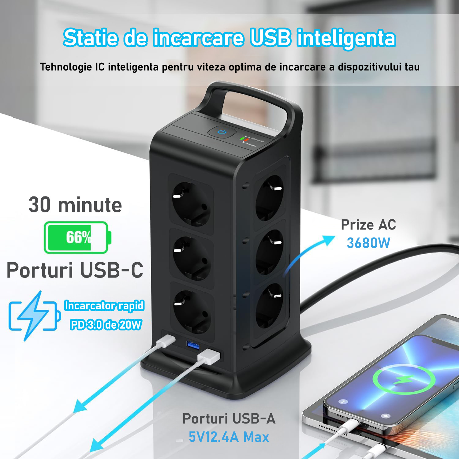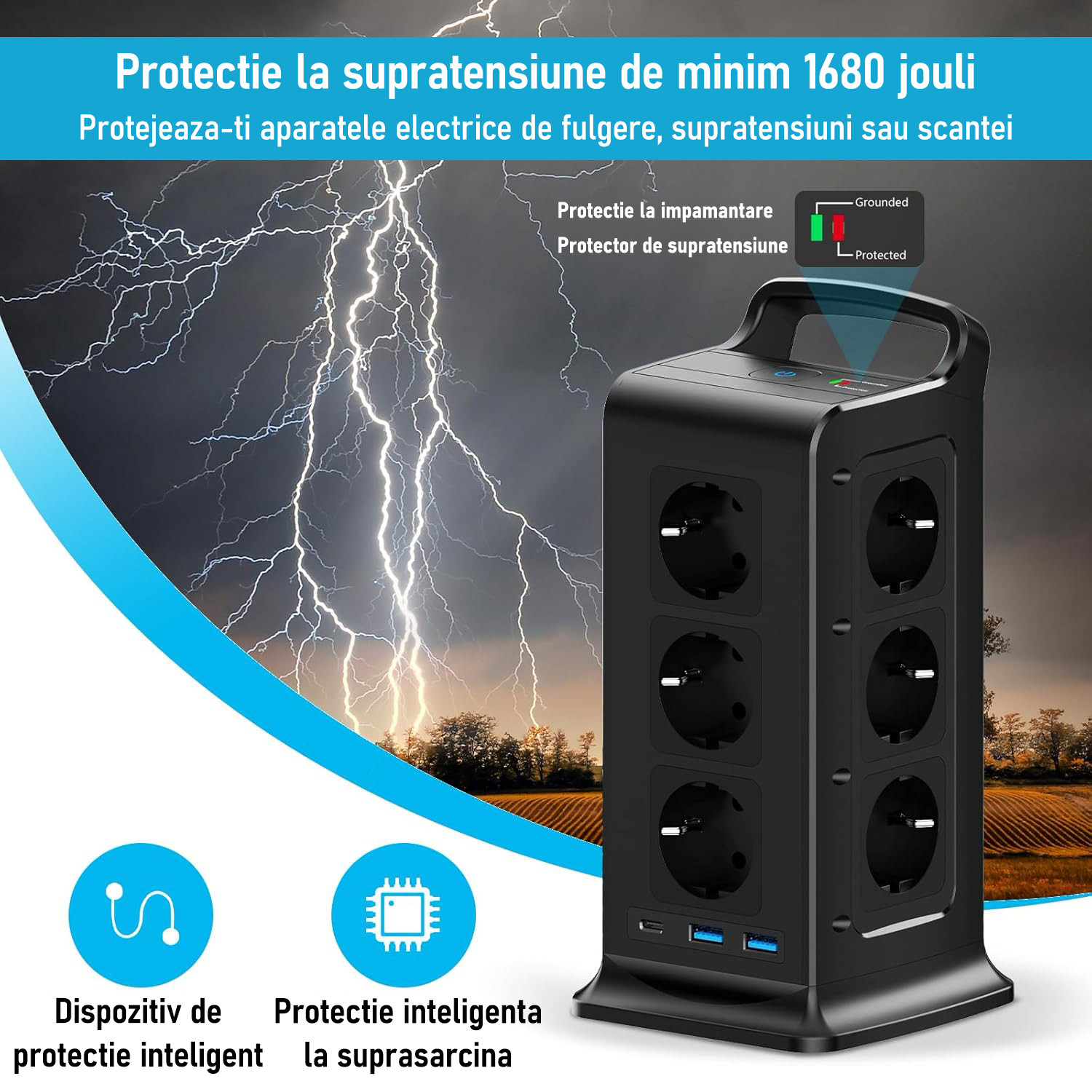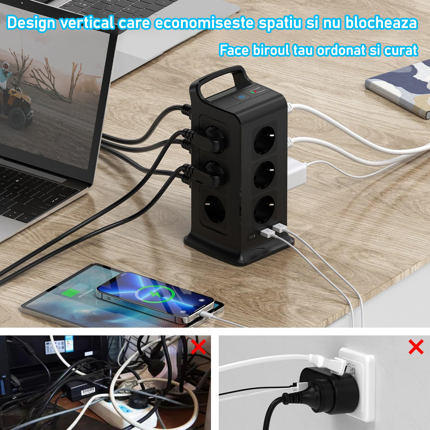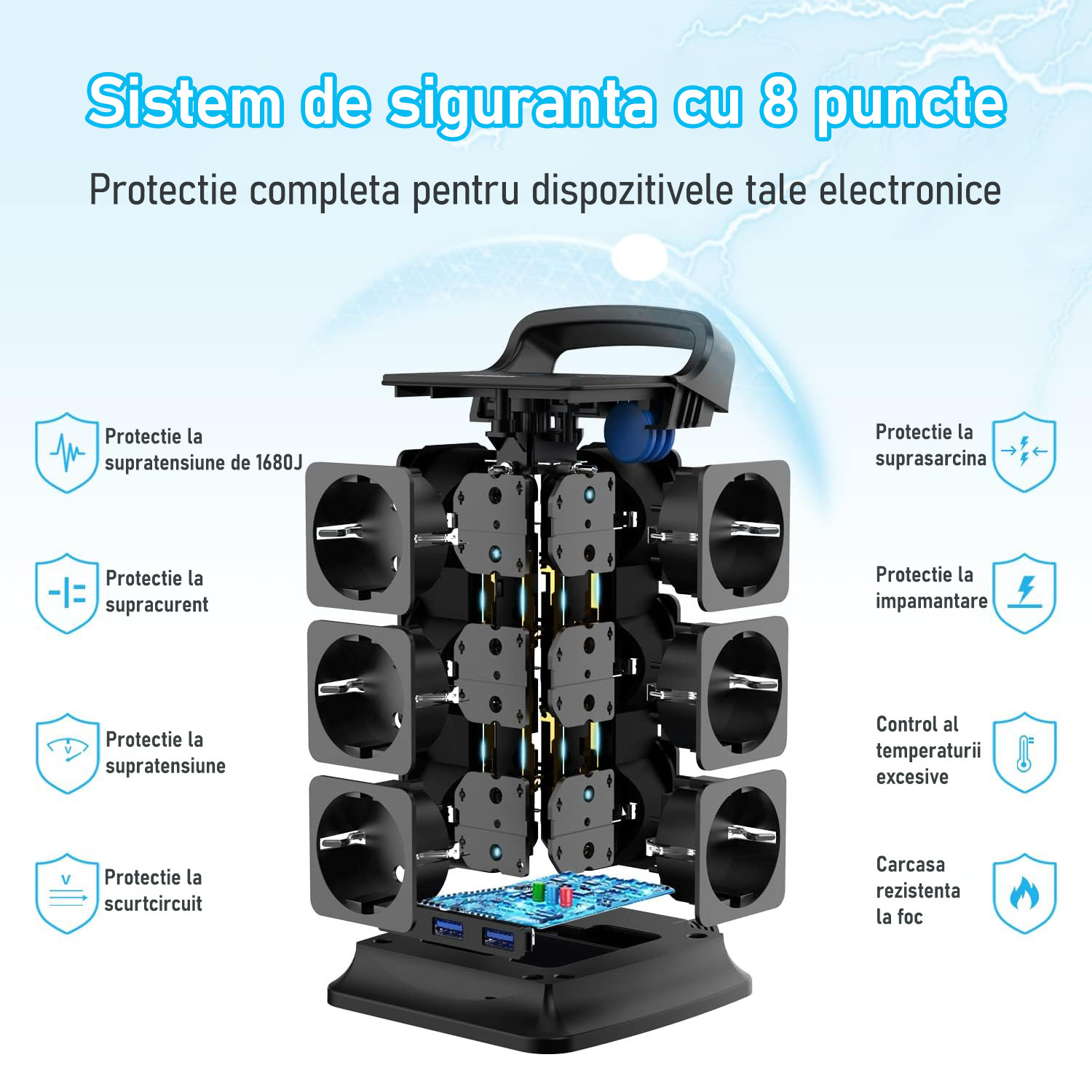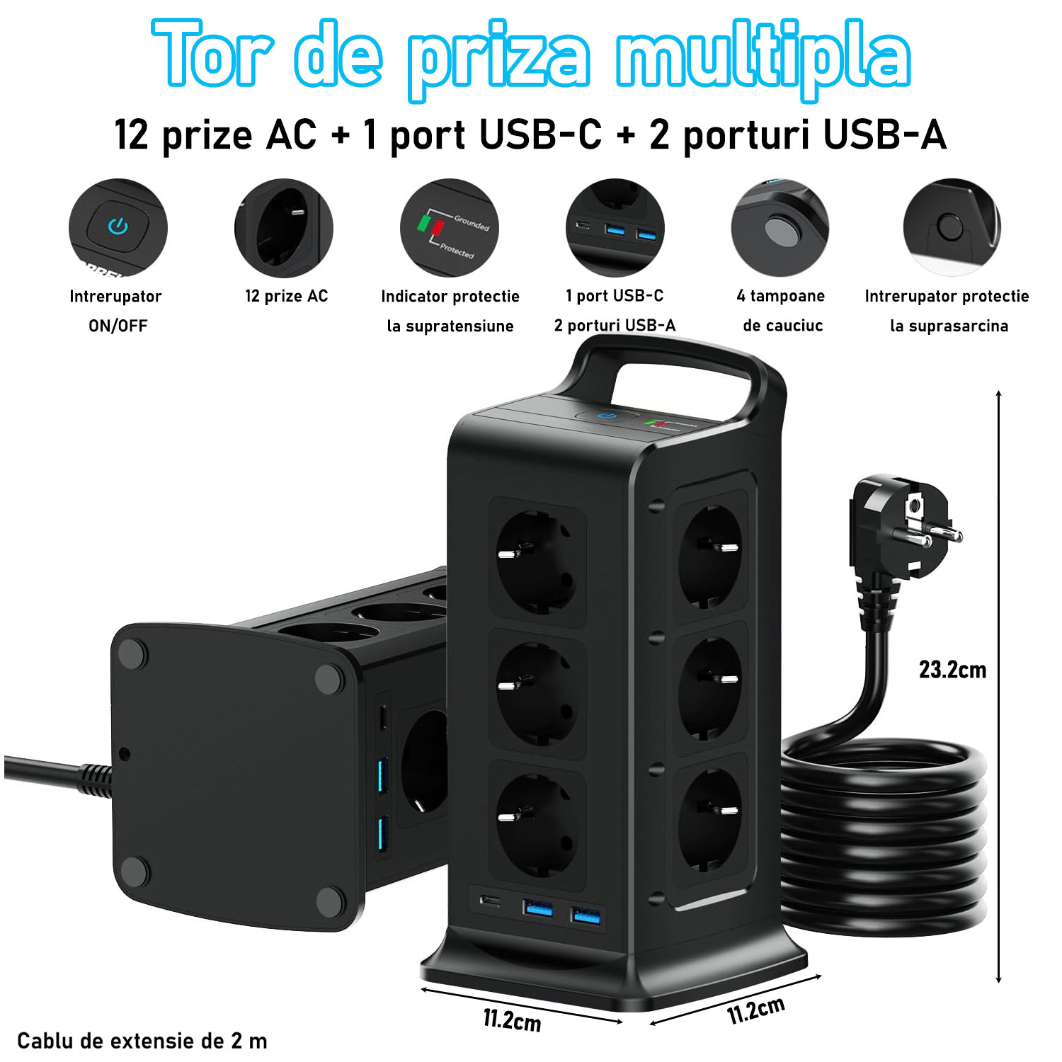 Prelungitor Tip Turn, BYONDSELF®, 4000W, 2xUSB/1xType-C PD20W/12xPrize, Protectie Supratensiune, Cordon 2m, Negru