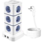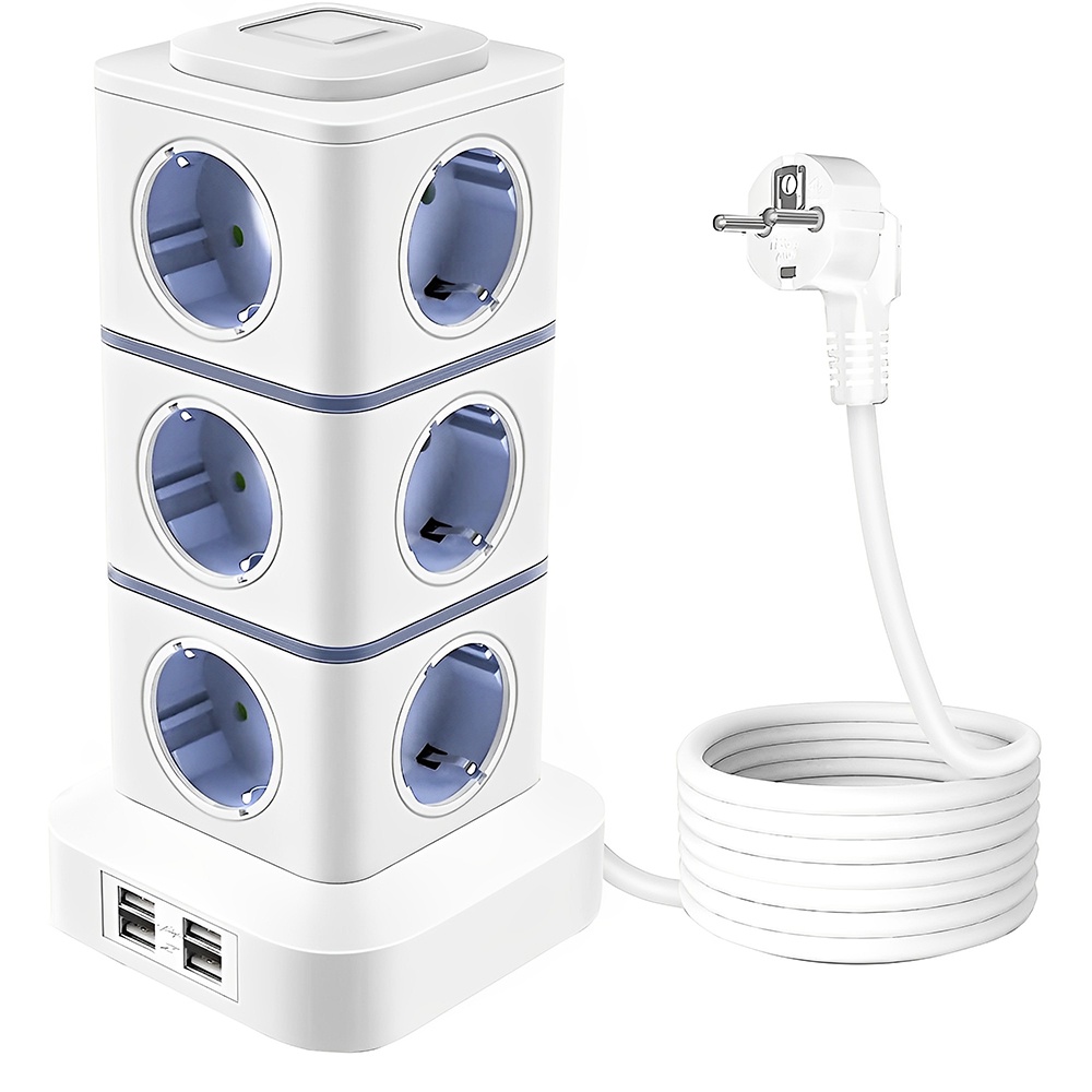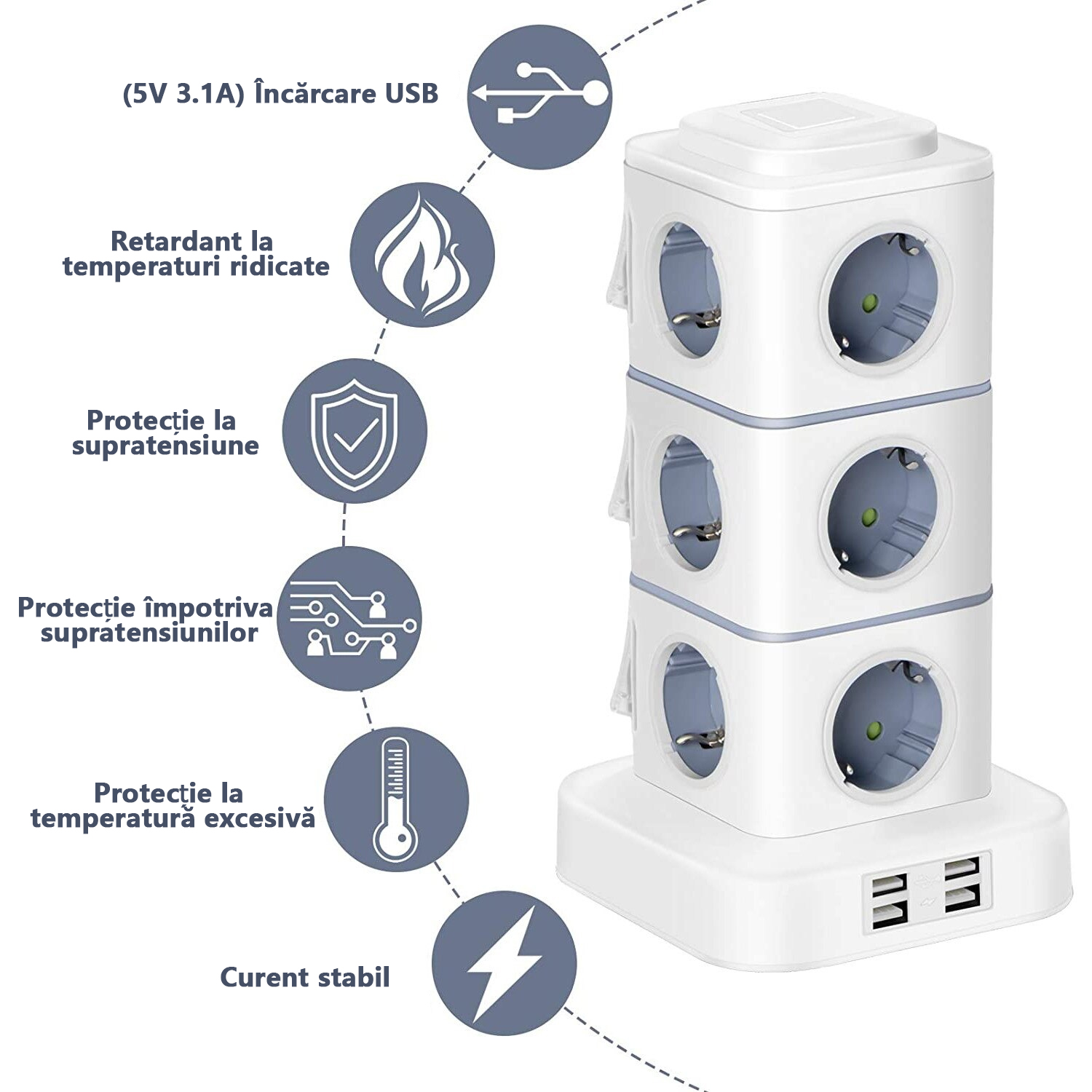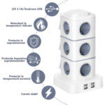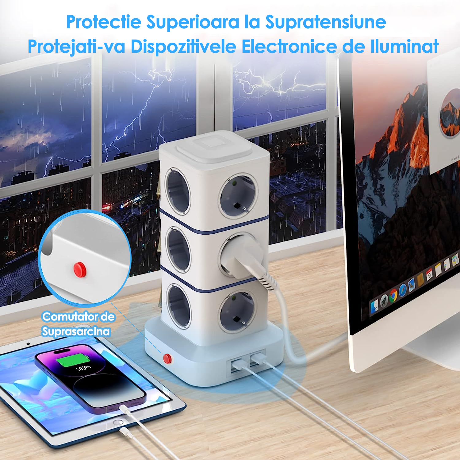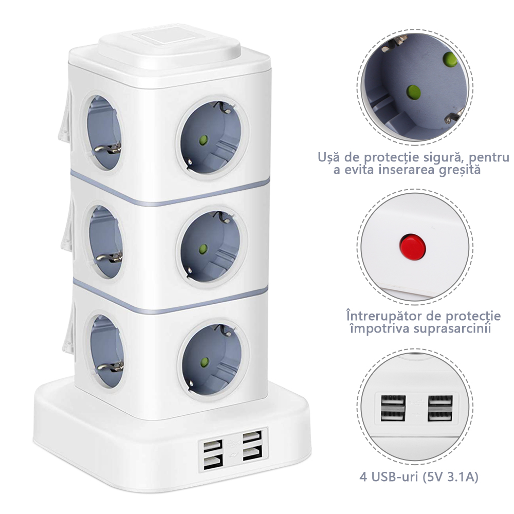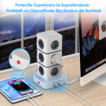 Prelungitor cu protectie designul in forma de turn distribuie prizele vertical pe cele patru laturi ale prizei, ofera suficient spatiu intre prelungitor si evita prea multe cabluri pentru toate dispozitivele electrice |
