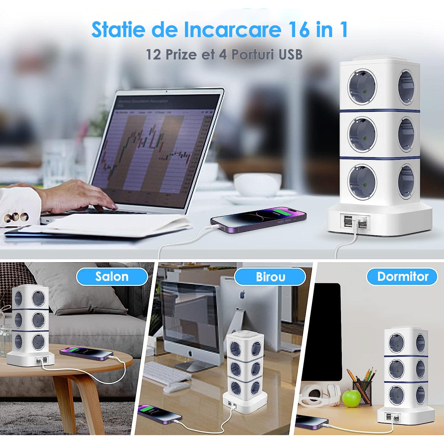 Prelungitor Tip Turn, BYONDSELF®, 4xUSB Porturi/12x Prize de Curent Alternativ, 3 Intrerupator Individuel 2500W, cu Protectie Copii, Protectie Suprasarcina, Protectie Impotriva Supratensiunii, 1.8M, Alb