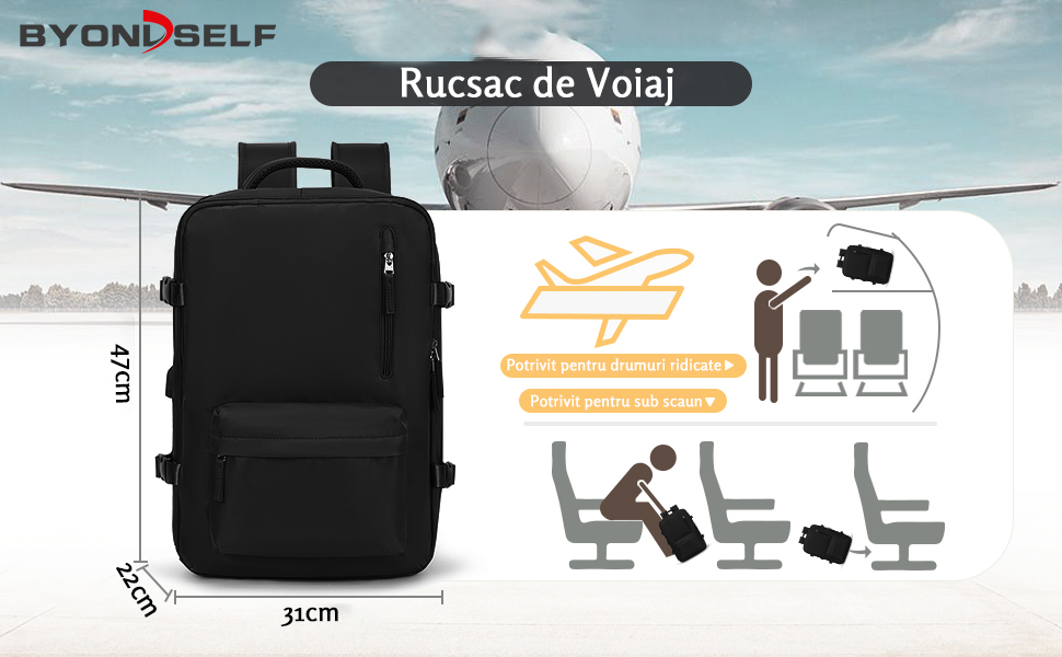Rucsac de Voiaj, BYONDSELF®, pentru Avion, Extensibil 36-42L, Impermeabil, Deschidere la 180 de Grade, cu Compartiment pentru Laptop de 16 Inch/Compartiment pentru Pantofi, pentru Barbati si Femei, 31×22×47cm