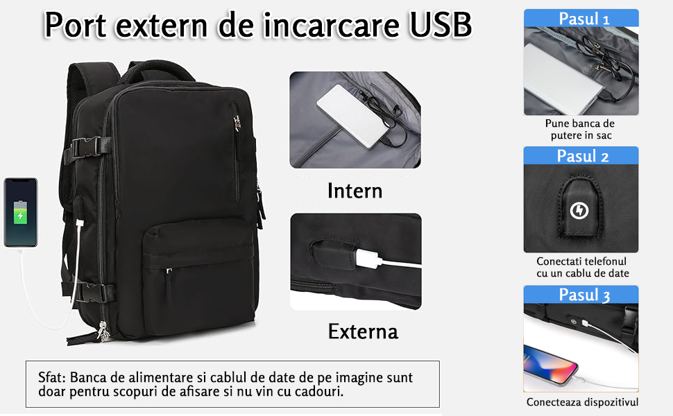 Rucsac de voiaj pentru avion are un port de incarcare incorporat, permitandu-va sa va incarcati telefonul sau alte dispozitive electronice oricand si oriunde. 【Pasi de utilizare】 1. Puneti sursa de alimentare in rucsac. 2. Conectati sursa de alimentare la dispozitivul care trebuie incarcat. 3. Incepe sa te bucuri de o calatorie fara griji! |