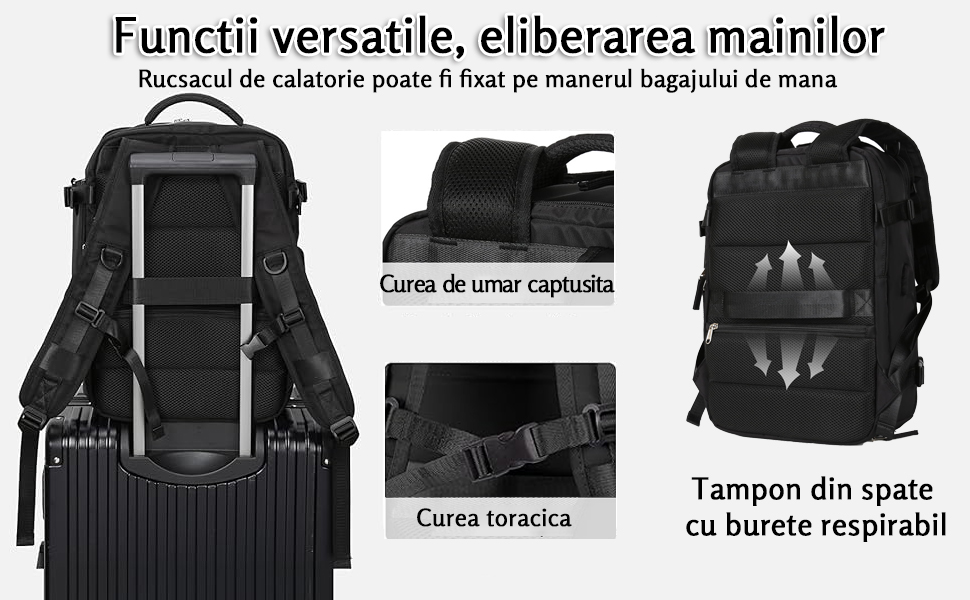 Echipat cu un capac de tija de tragere: Capacul special echipat pentru tija de tragere de pe spate poate fixa ferm rucsac de voiaj pe manerul bagajului, reducand considerabil sarcina pe calatorie. Tesatura din plasa respirabila Fengwo: Are rezistenta buna si ventilatie, care ajuta la mentinerea spatelui proaspat. |