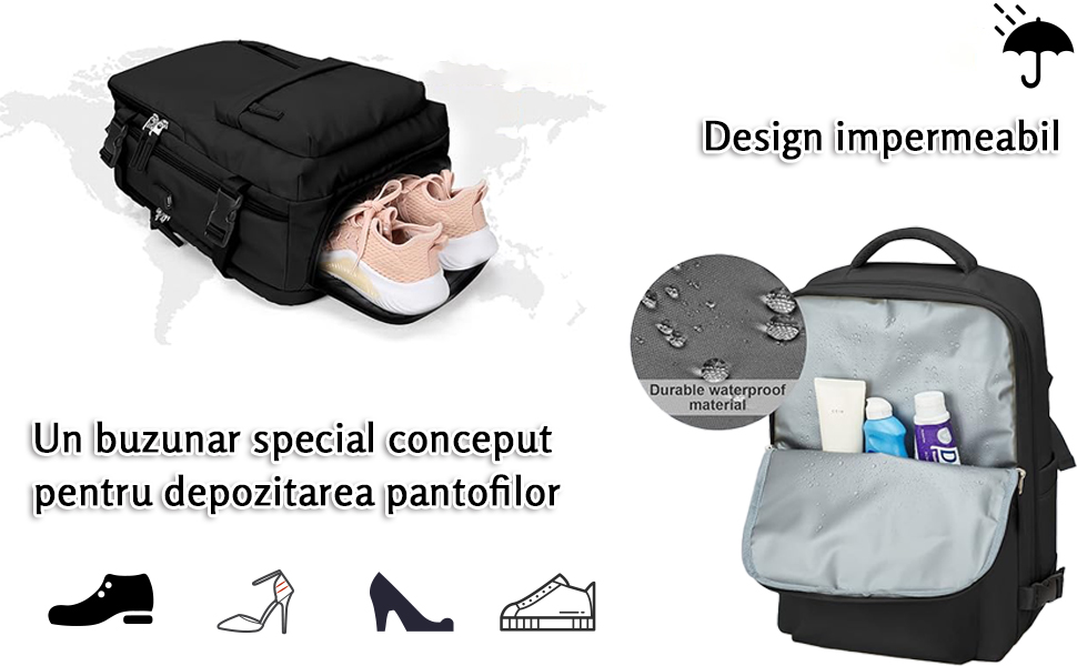 Buzunar de depozitare specializat:Includ un buzunar special pentru depozitarea hainelor umede si un buzunar pentru plasarea pantofilor, ajutandu-va sa va organizati mai bine bagajele. |