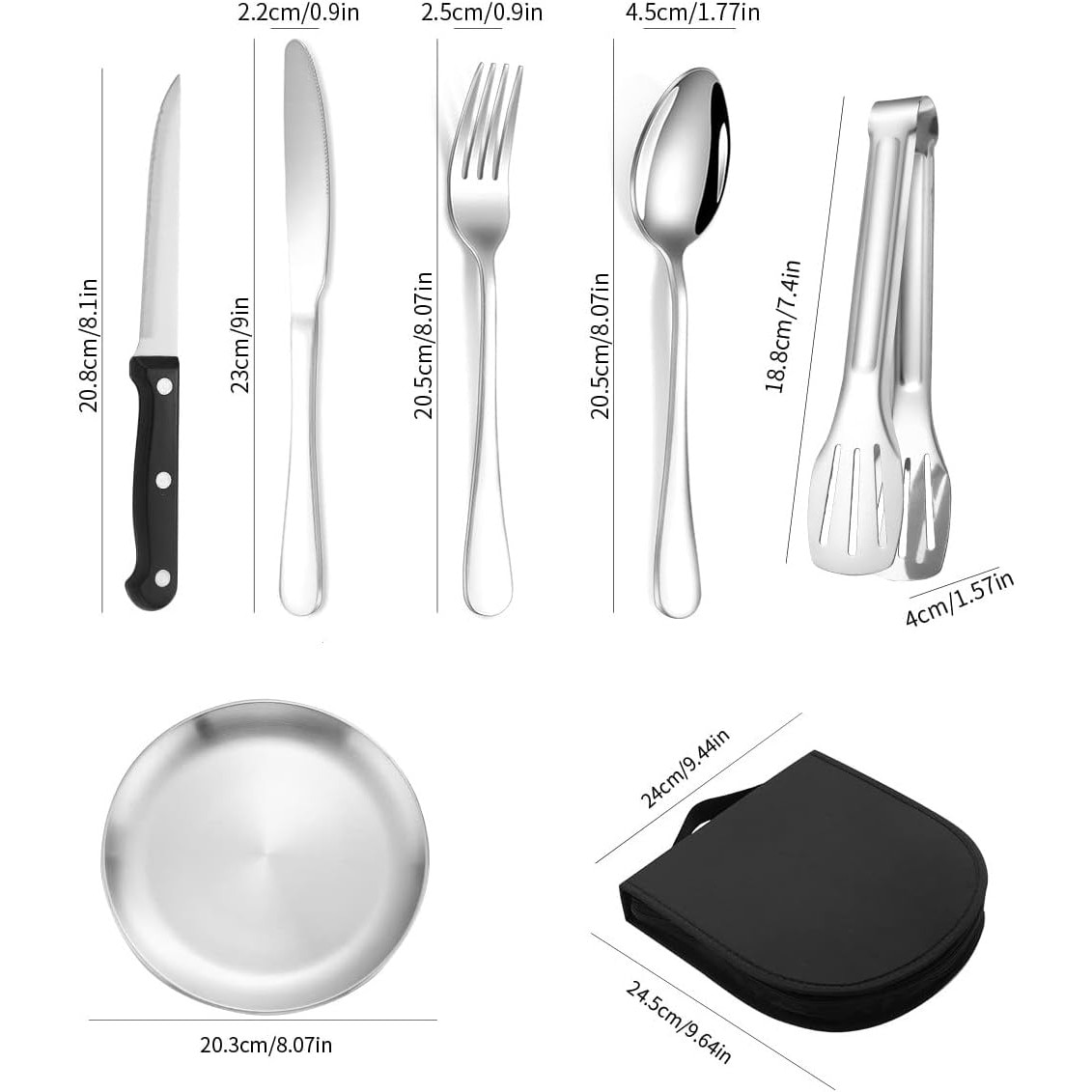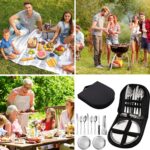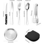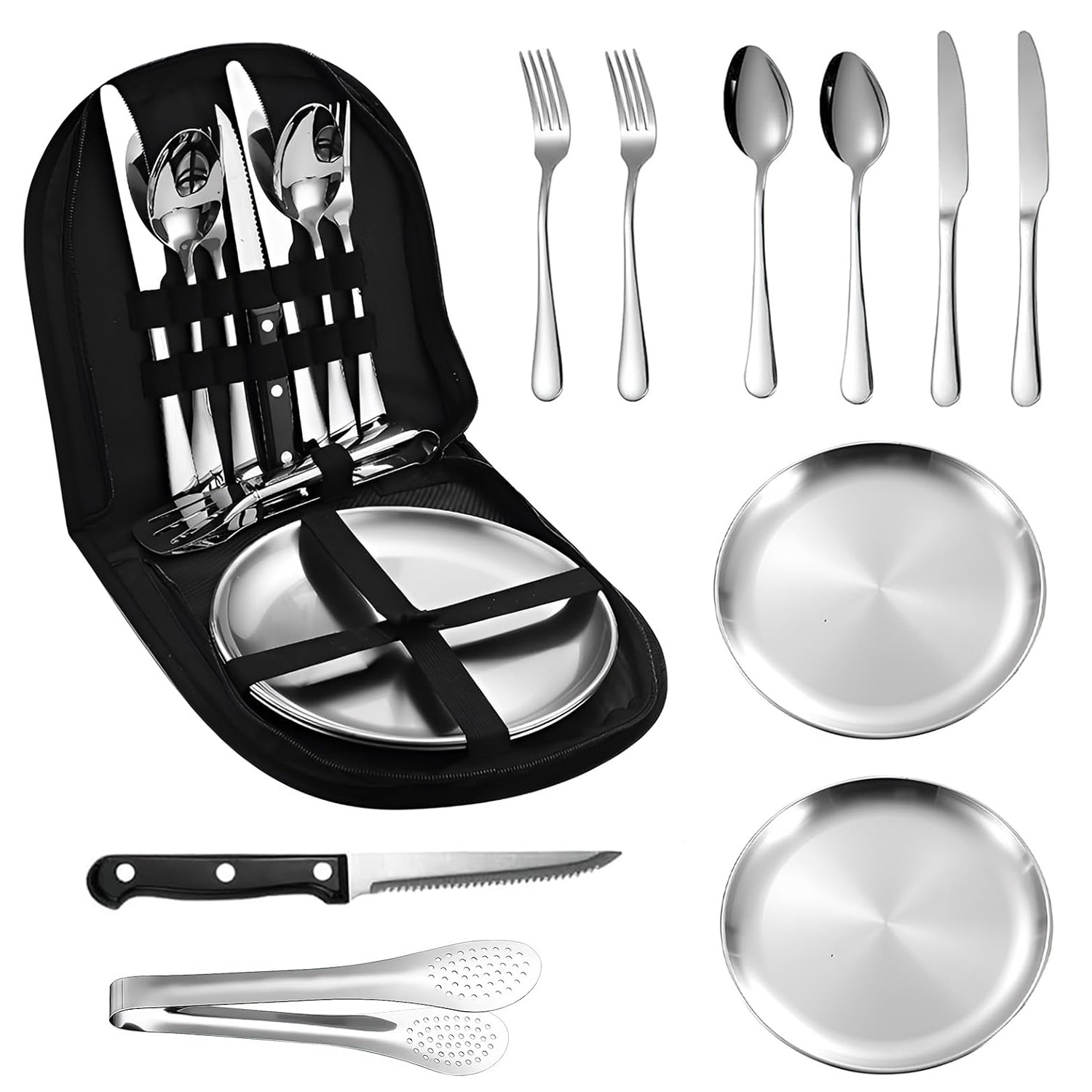 Set de tacamuri de camping: setul de tacamuri de camping consta din 2 x furculite, 2 x linguri, 2 x cutite de masa, 1 x cutit pentru unt, 2 x 8 inch farfurii, 1 x clema pentru friptura, 1 x geanta portabila de depozitare. Perfect pentru cupluri sau prieteni in campare sau picnicuri.