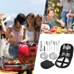 Set de tacamuri portabile: carcasa impermeabila are grile in interior pentru a va ajuta sa organizati si sa sortati vasele si exista curele elastice pentru a le impiedica sa cada.