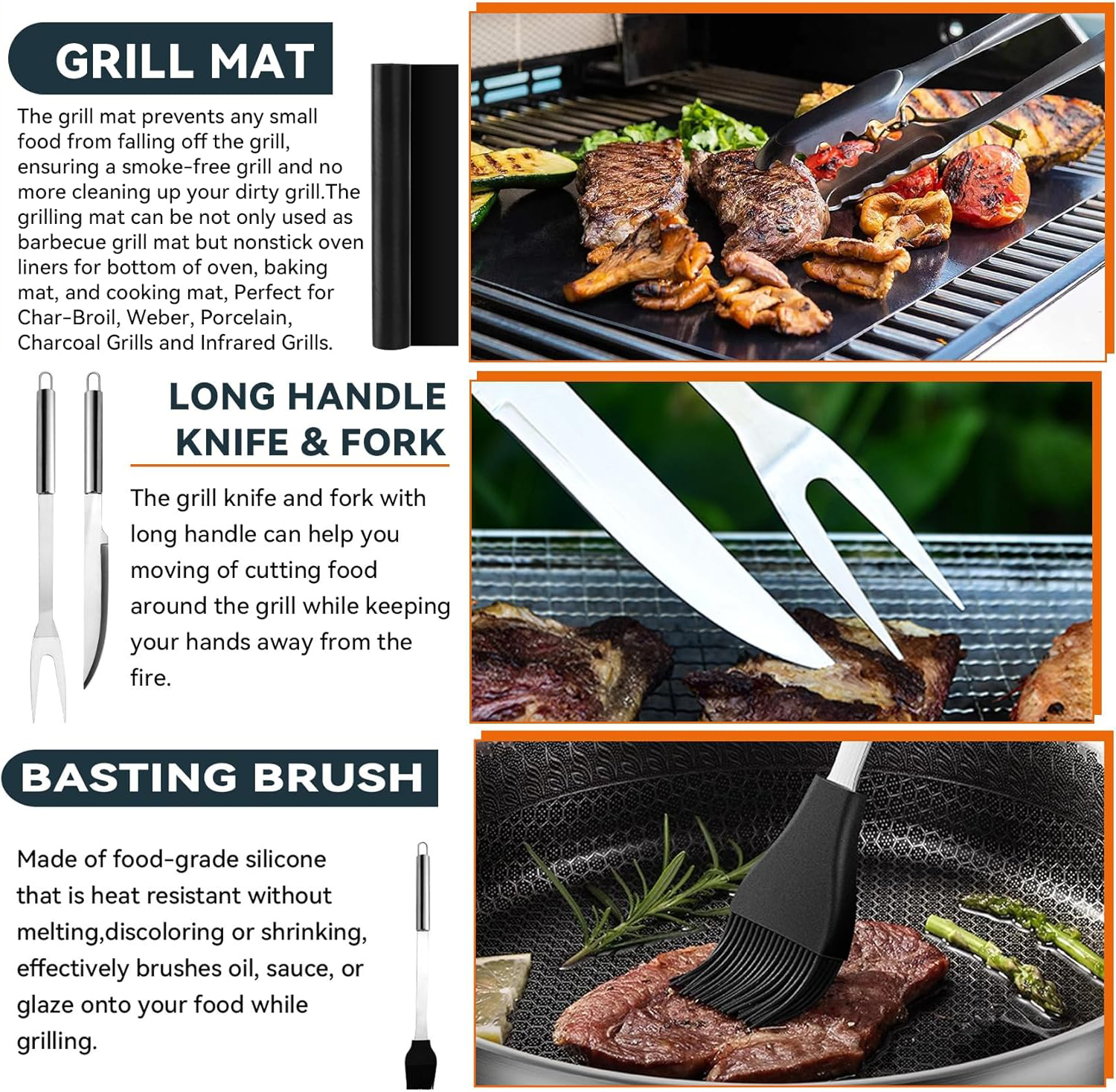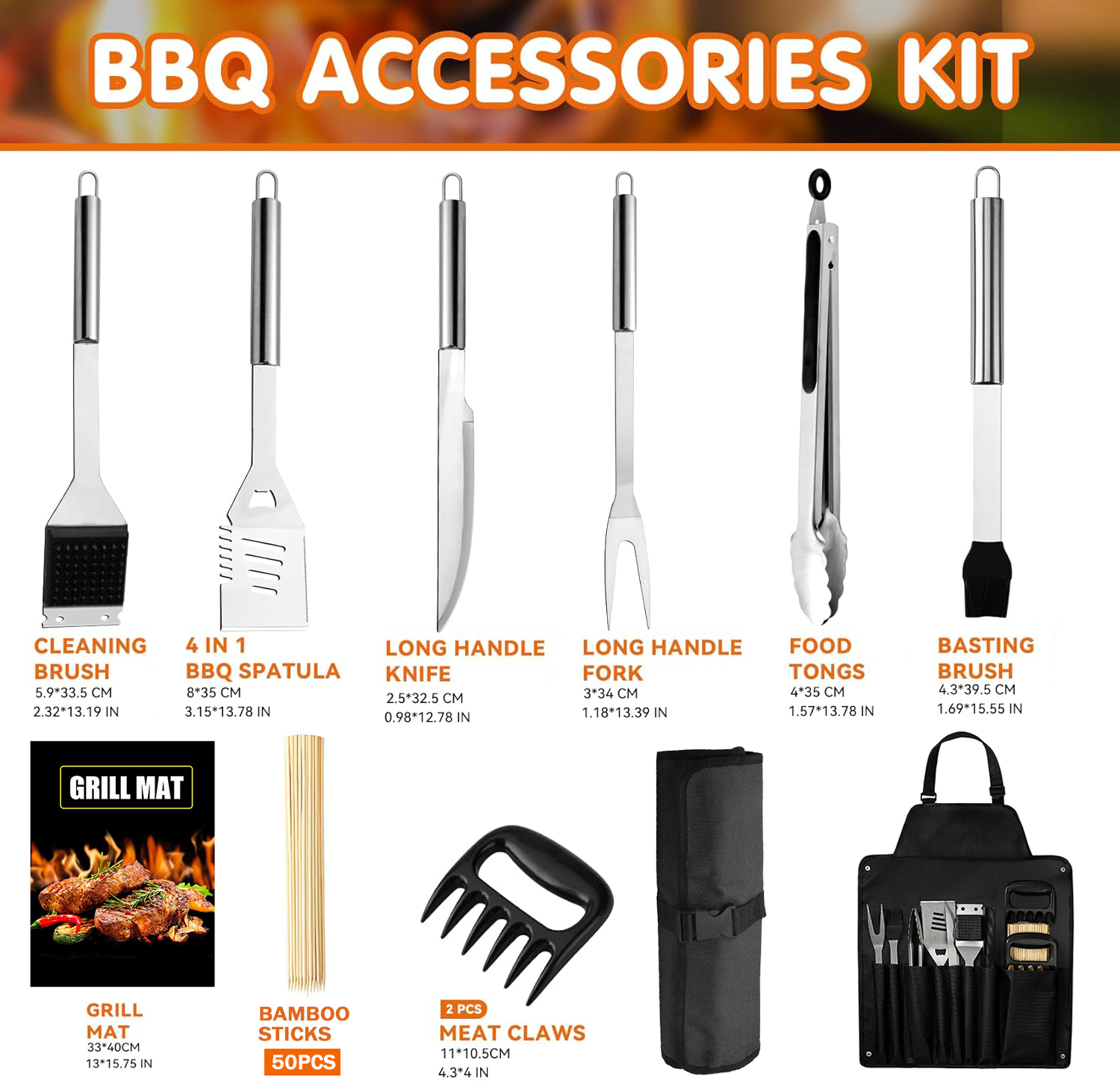 Acest set ustensile pentru gratar include toate accesoriile esentiale pentru o experienta de gratar reusita: o spatula, un cleste, 50 de frigarui din bambus, un covoras pentru gratar, 2 gheare de carne, o furculita, un cutit, o perie din silicon, o perie de curatare a gratarului si un sort. Fie ca esti un incepator sau un expert in gratare, acest set iti va oferi toate instrumentele necesare pentru a incepe imediat.