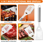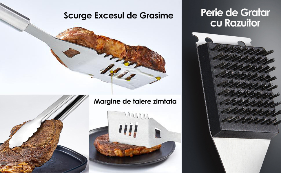 Clestele cu blocare din acest set ustensile pentru gratar ofera o prindere puternica si stabila, asigurandu-te ca poti manevra alimentele cu usurinta. Spatula include un deschizator de sticle incorporat, oferind un plus de utilitate la fiecare gratar. Ghearele de carne sunt ascutite, fiind ideale pentru maruntirea rapida a porcului sau pentru ridicarea usoara a unui pui intreg.