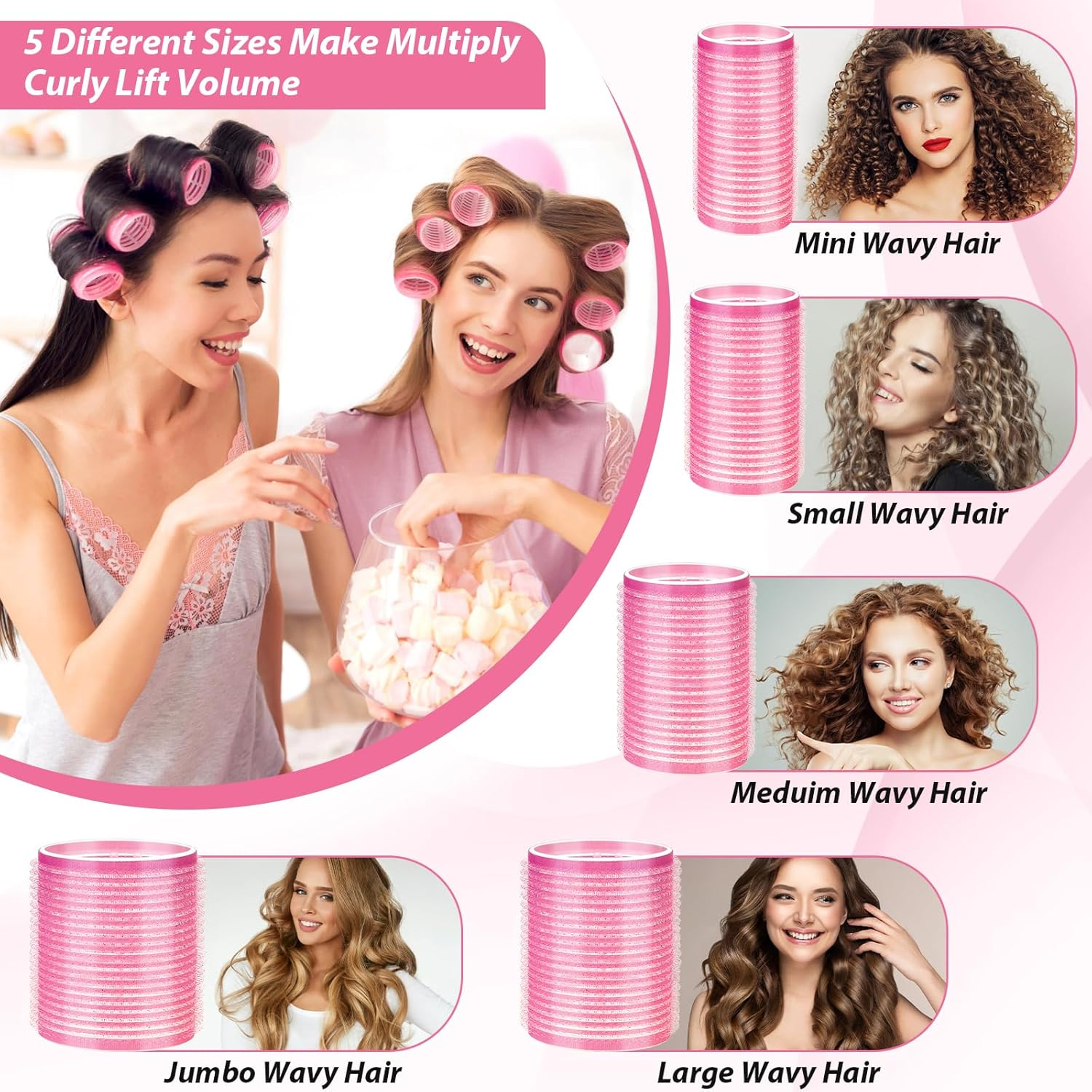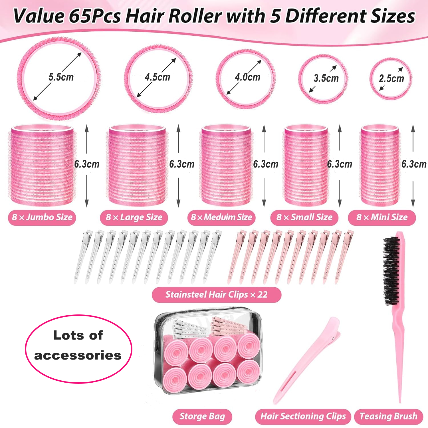 Set 65 Bigudiuri Profesionale de Par, BYONDSELF®,5 Marimi, cu Agrafe Par/Geanta Mana, pentru Volum si Bucle, Roz