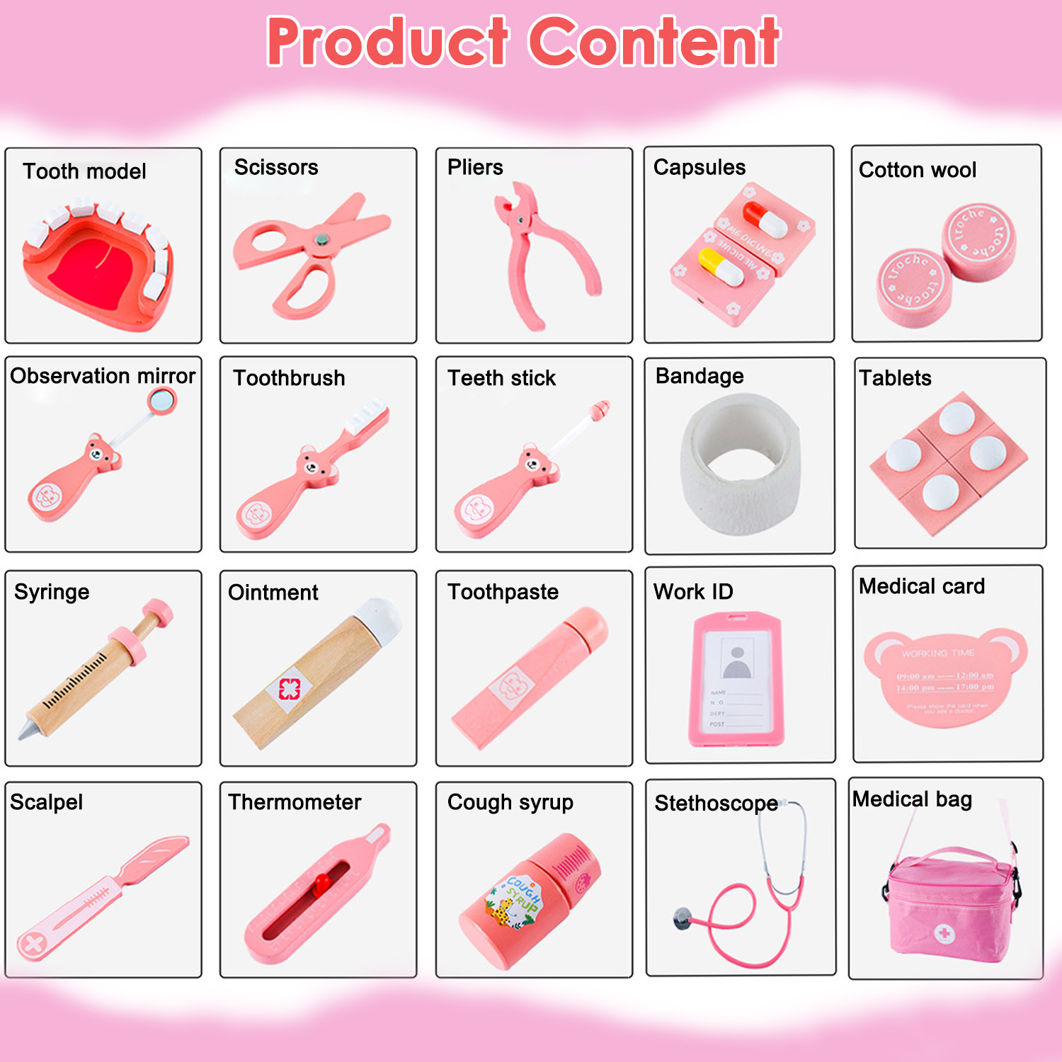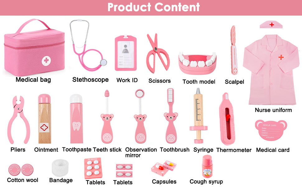 | Copilul tau rezista sa se spele pe dinti? Ti-e foarte frica sa mergi la spital? Multi copii se tem de spitale. Jucariile noastre includ multe instrumente comune, cum ar fi termometre, periute de dinti, uniforme de asistenta si dinti, etc. Materialele din lemn sunt mai durabile. joaca, isi reduc teama de procedurile medicale, cresc, de asemenea, interactiunea dintre parinti si copii si imbunatatesc creativitatea si abilitatile cognitive ale copiilor. |