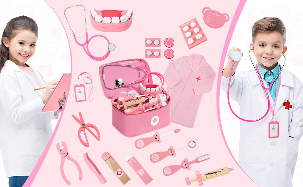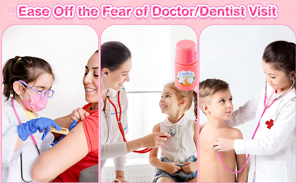 | [Depaseste frica, imbunatateste abilitatile] Set de joaca doctor este o jucarie educationala care ii ajuta pe copii sa-si depaseasca frica de medici in timp ce isi imbunatateste abilitatile de comunicare, concentrare, imaginatie si coordonare: Imbracati un costum de medic dentist pentru copii si pretindeti ca faceti exercitiile Temperatura corpului, ascultarea la bataile rapide ale inimii, copiii se vor familiariza cu produsele medicale si nu se vor mai teme sa vada medicul.