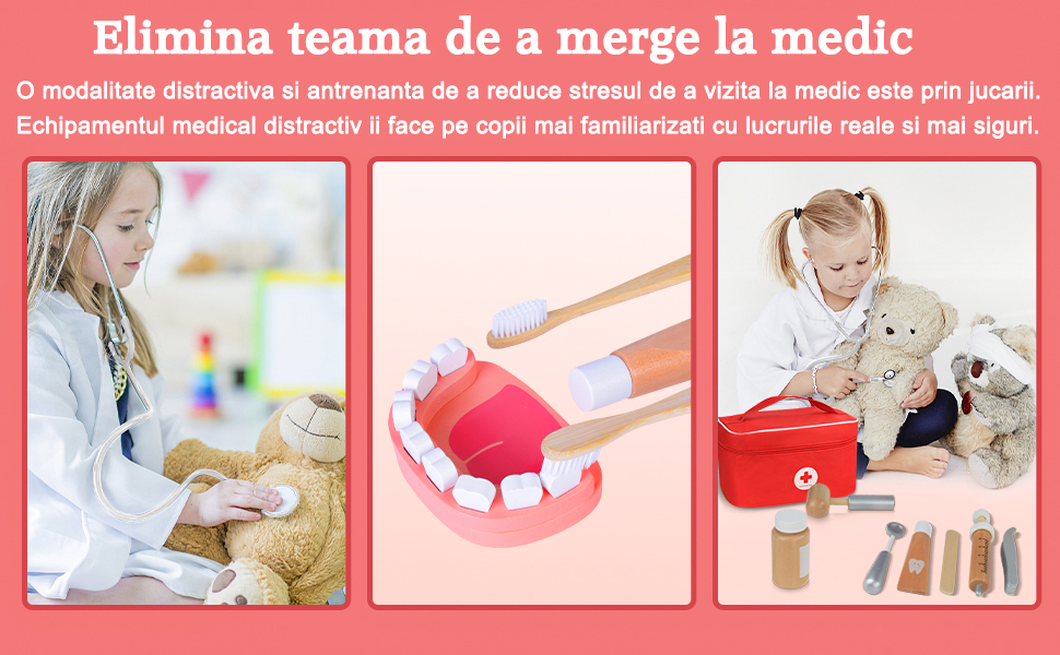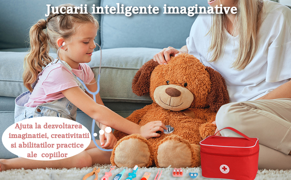 | Eliminarea fricii de a merge la medic Oferiti copilului un mediu de simulare medicala reala si lasati-l sa isi invinga teama de a merge la spital prin intermediul jocului. Versiunile jucause ale instrumentelor medicale fac copiii sa se familiarizeze mai bine cu lucrurile reale si sunt, de asemenea, mai sigure. Jucarii inteligente cu imaginatie bogata Introducerea acestor instrumente medicale ajuta la dezvoltarea imaginatiei, creativitatii si abilitatilor manuale ale copiilor. Este excelent pentru a juca in joaca cu parintii, surorile, fratii etc. |