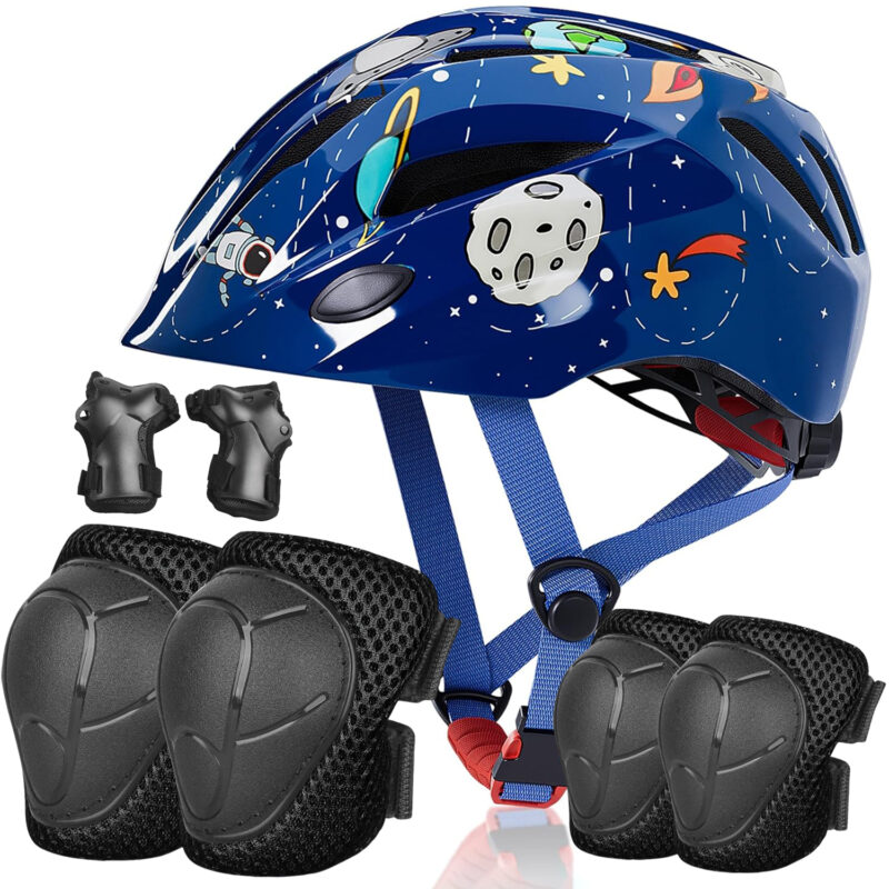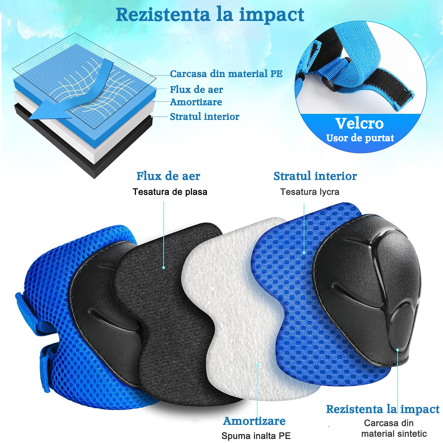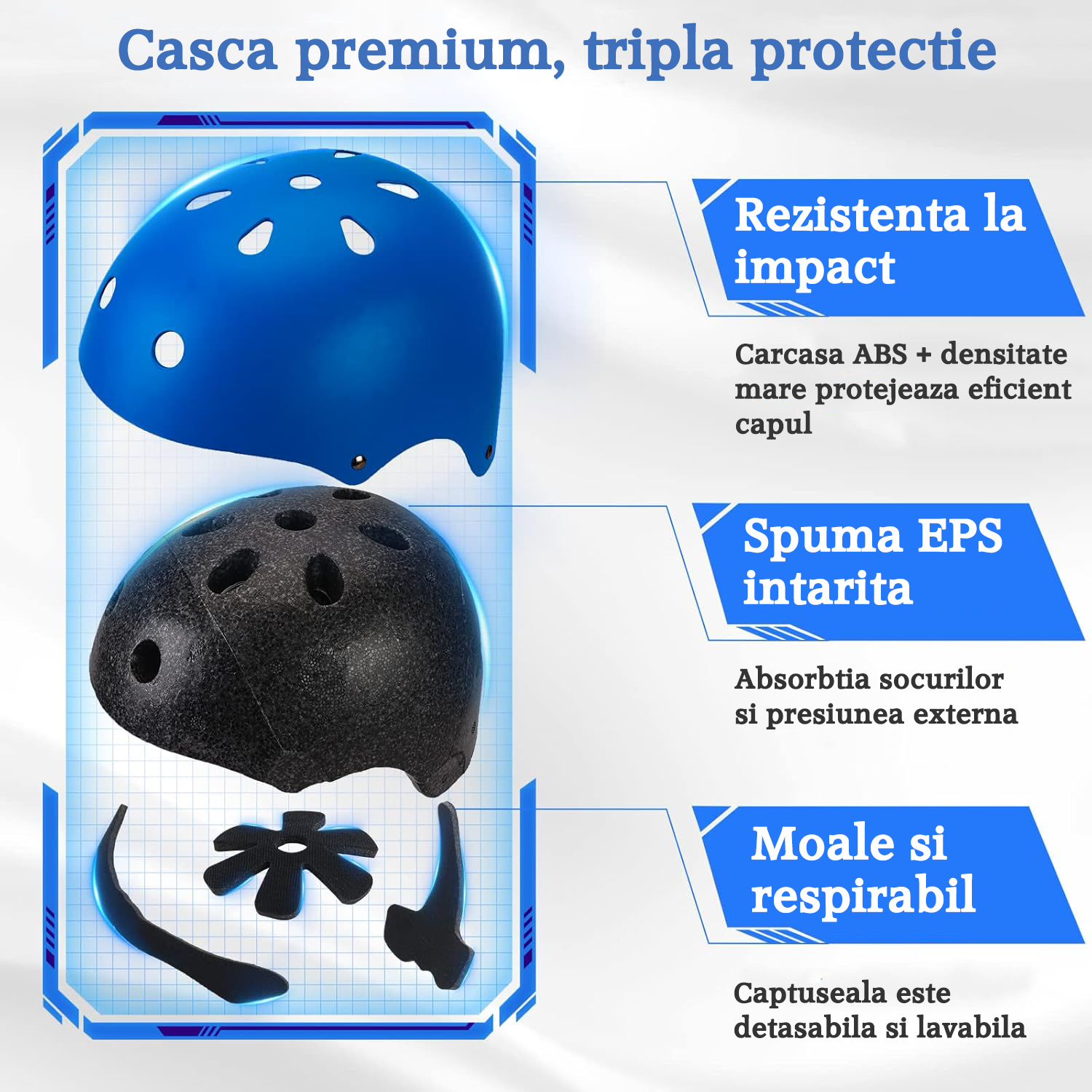 Set Protectie Pentru Copii, BYONDSELF®, Casca bicicleta copil, Tineri 3-13 ani, Genunchiere, cotiere si aparatori Incheieturi, pentru Ciclism, Patinaj, Skateboard, Circumferinta capului 50-54 cm, Albastru