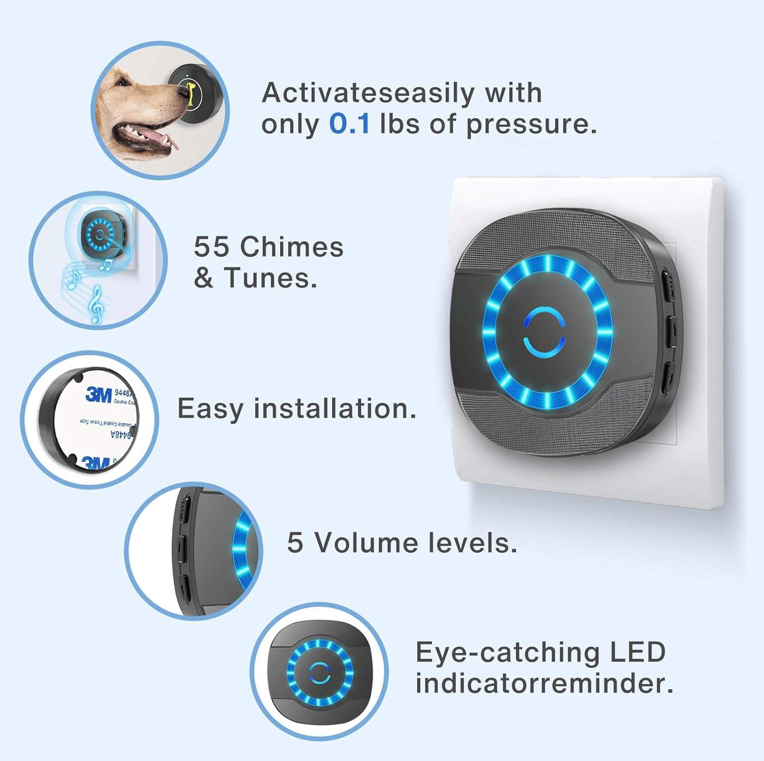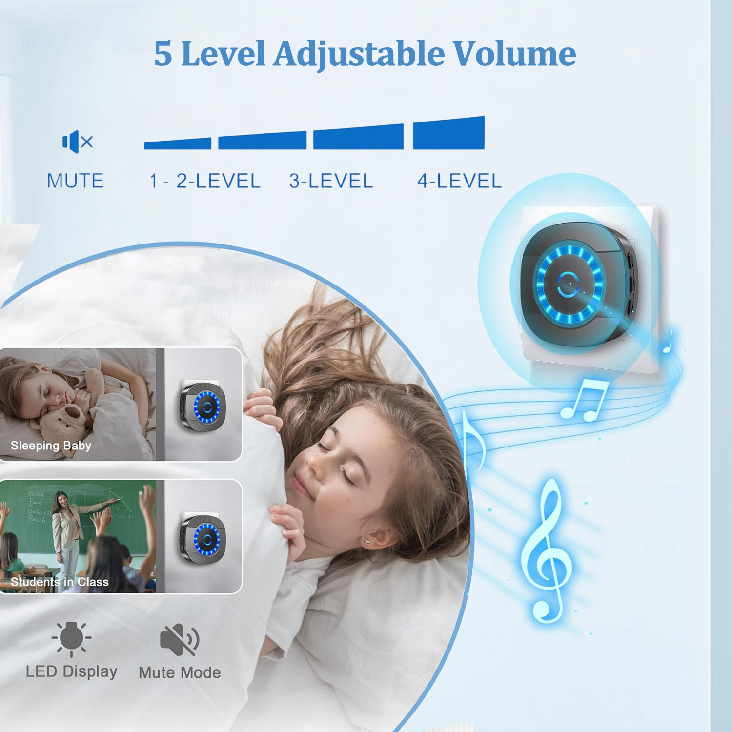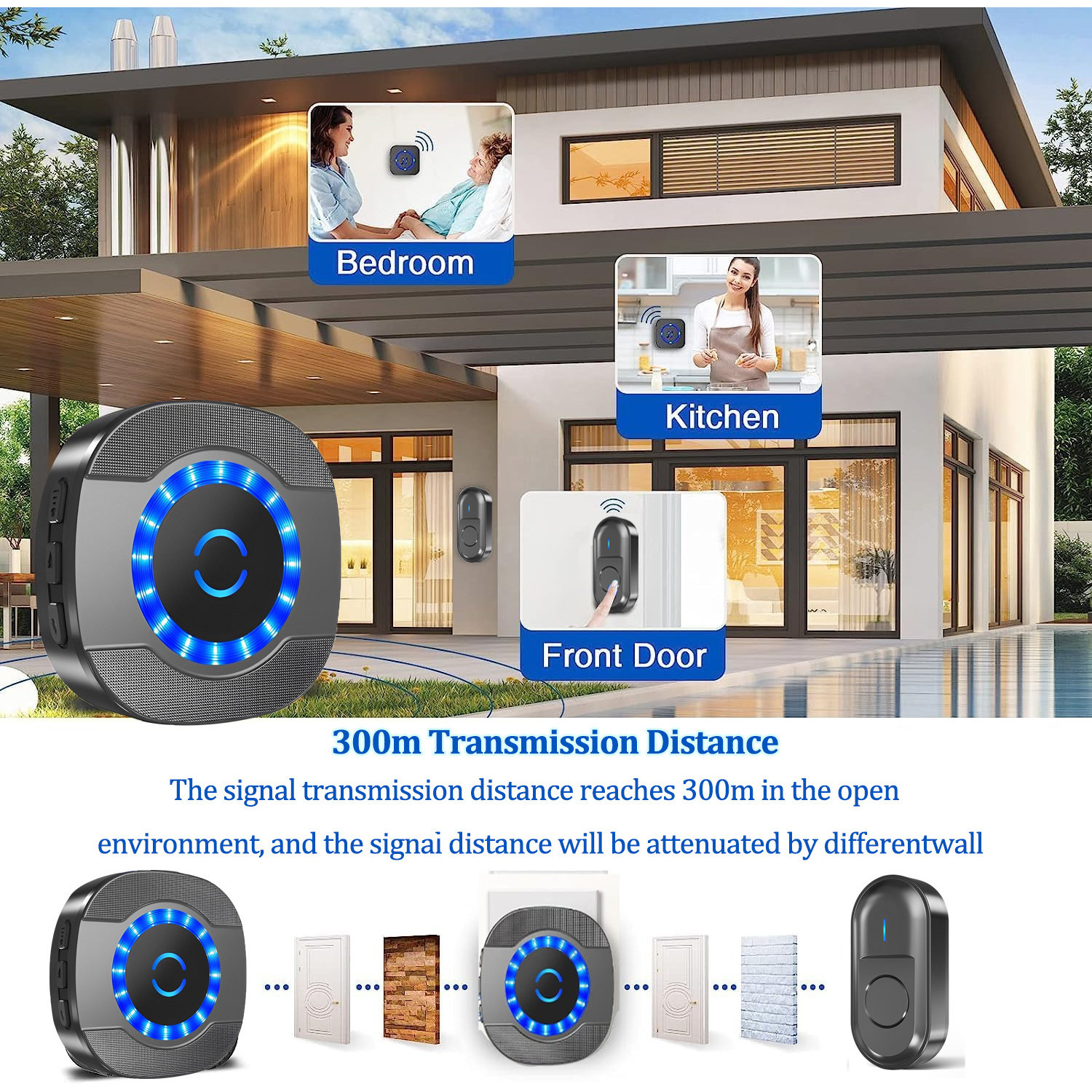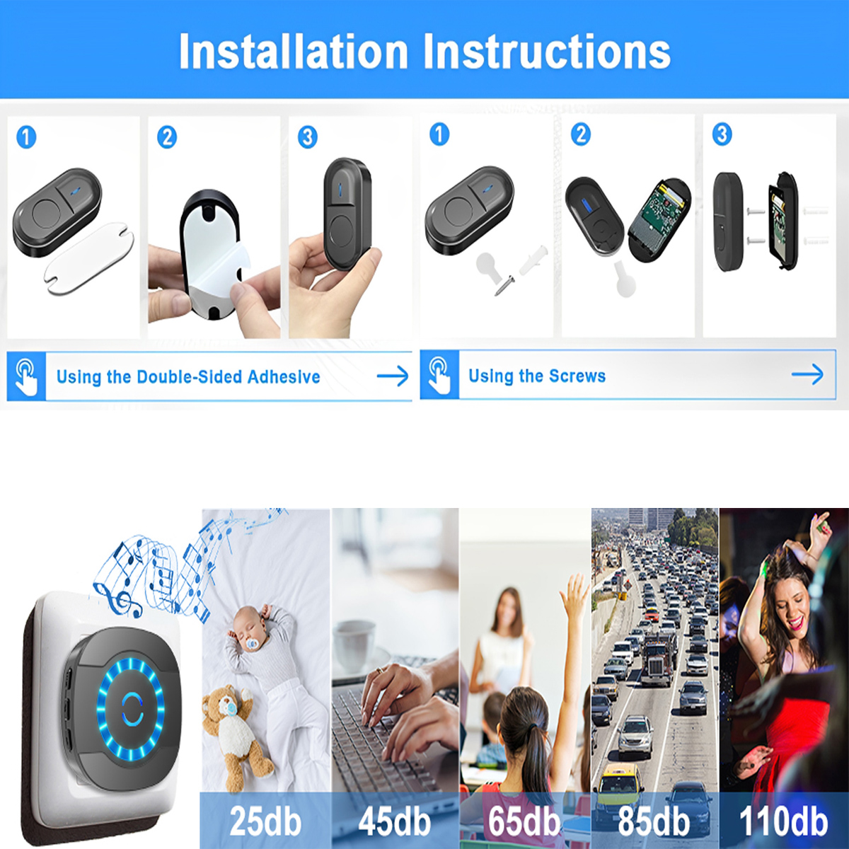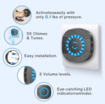 Soneria noastra ofera o raza de actiune de 300 de metri in zone deschise, asigurandu-va ca sunteti mereu conectat. Ideala pentru case, birouri, vile, scoli si alte locatii mari. 【Instalare rapida si usoara】 Montati transmitatorul wireless in cateva secunde folosind suruburile sau benzile incluse. Se instaleaza in mai putin de un minut, fara complicatii. 【Rezistenta la orice conditii meteo】 Soneria este rezistenta la praf si apa, cu o gama de temperatura intre -30°C si 70°C. Beneficiaza de un consum redus de energie si o durata de viata a bateriei de pana la 1-3 ani, rezistand in conditii dure. 【Sunet personalizat, mod flexibil】 Alegeti din 5 nivele de volum (pana la 110 dB), perfect pentru persoanele cu deficiente de auz sau varstnicii. Comutati usor intre modurile LED doar sau LED + ton de apel si alegeti din cele 55 de melodii personalizate. Ultimele setari sunt salvate pentru confort continuu. |