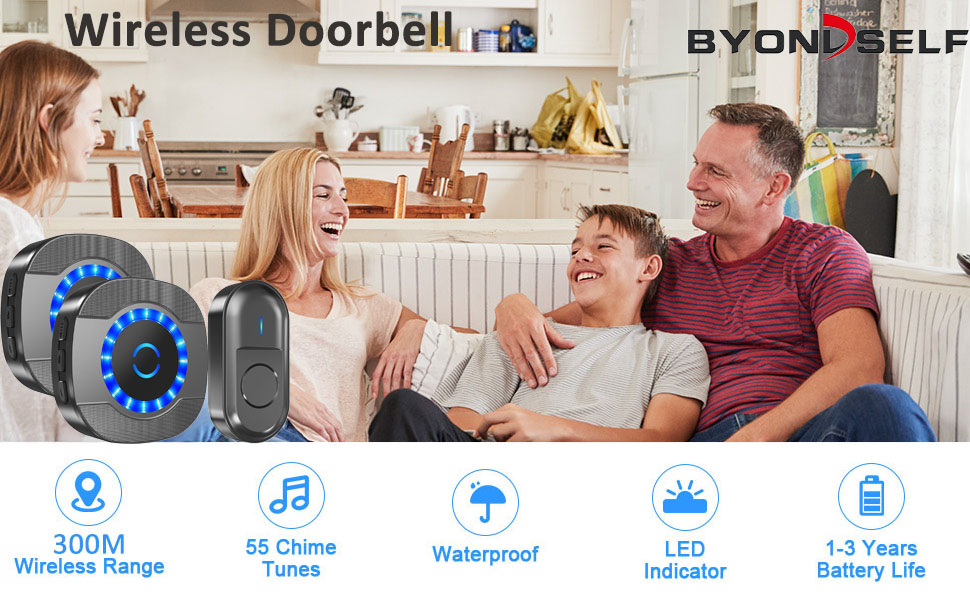 Sonerie Fara Fir/ Wireless, BYONDSELF®, Lumina LED, cu 1 Transmitator/2 Receptoare, 300 Metri, 5 Nivele de Volum, 55 de Melodii, Negru