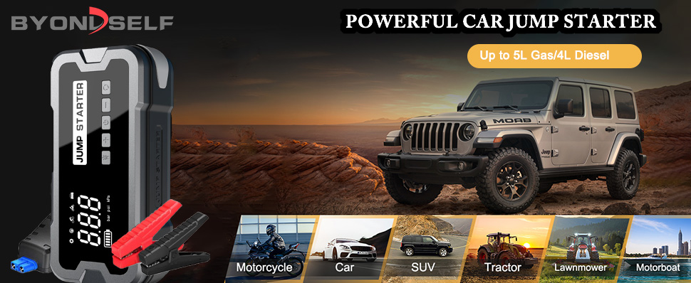 Starter Auto, BYONDSELF®, 4 in 1, 4000A, 12V, 24000mAh, Baterie Externa/Compresor de Aer Functie, Ecran Digital, 3 Moduri de Lumina LED, Protectie Inteligenta, Portabil, Pentru 5.0L Motor Benzina/4.0L Diesel, Negru