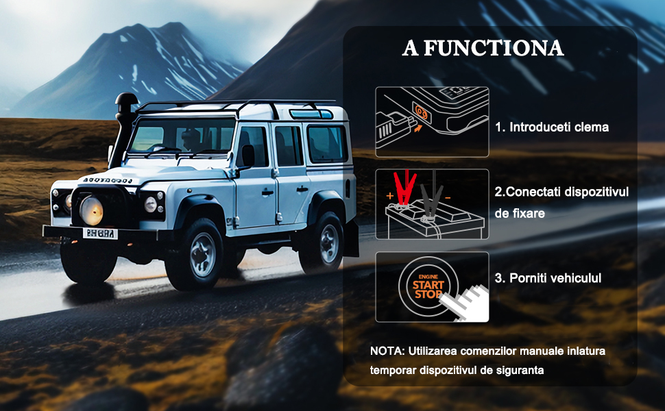 1. Conectati sursa de alimentare si introduceti stecherul in starter auto multifunctional 2. Conectati clema placii de nichel la baterie 3. Porniti vehiculul NOTA: Utilizarea comenzilor manuale inlatura temporar dispozitivul de siguranta |
