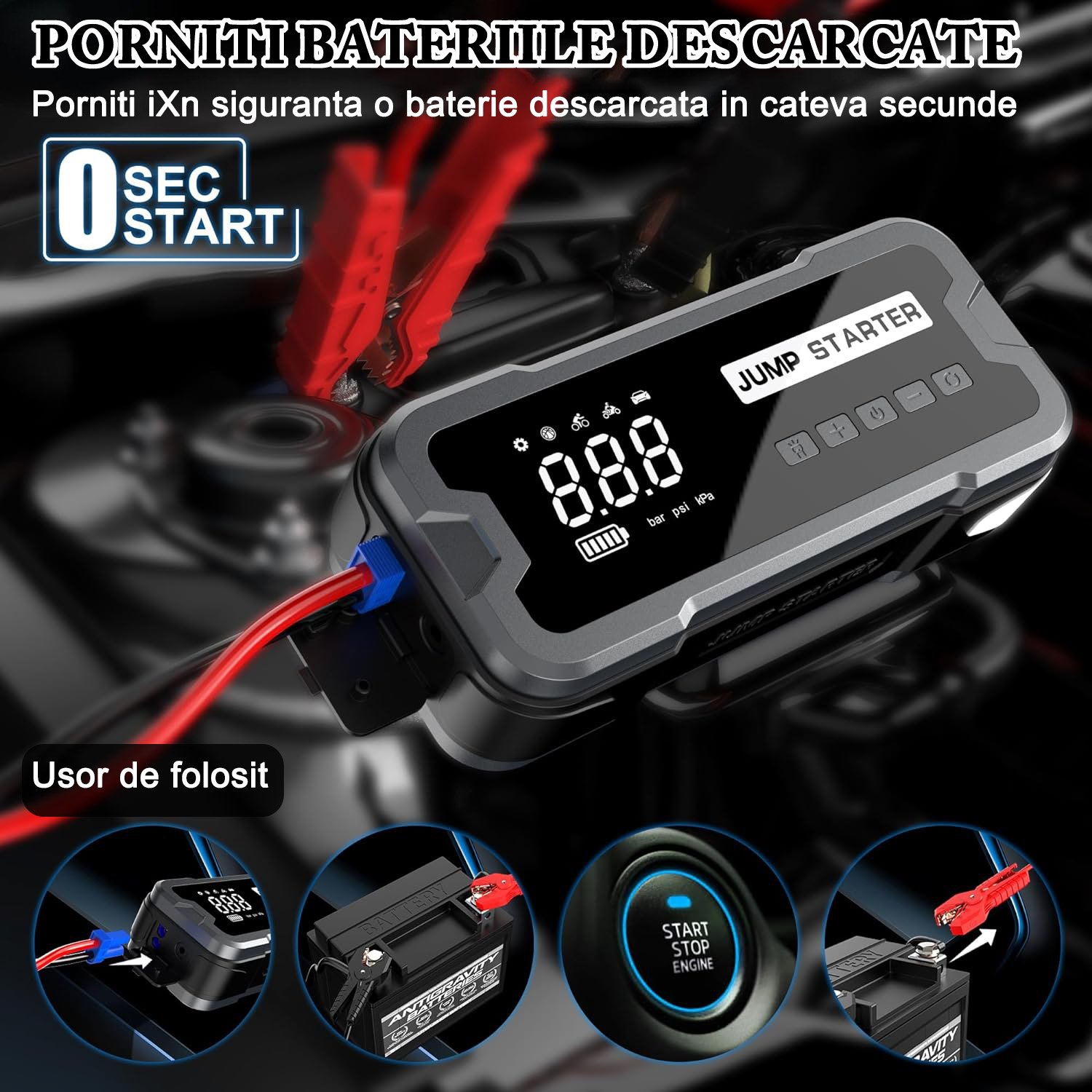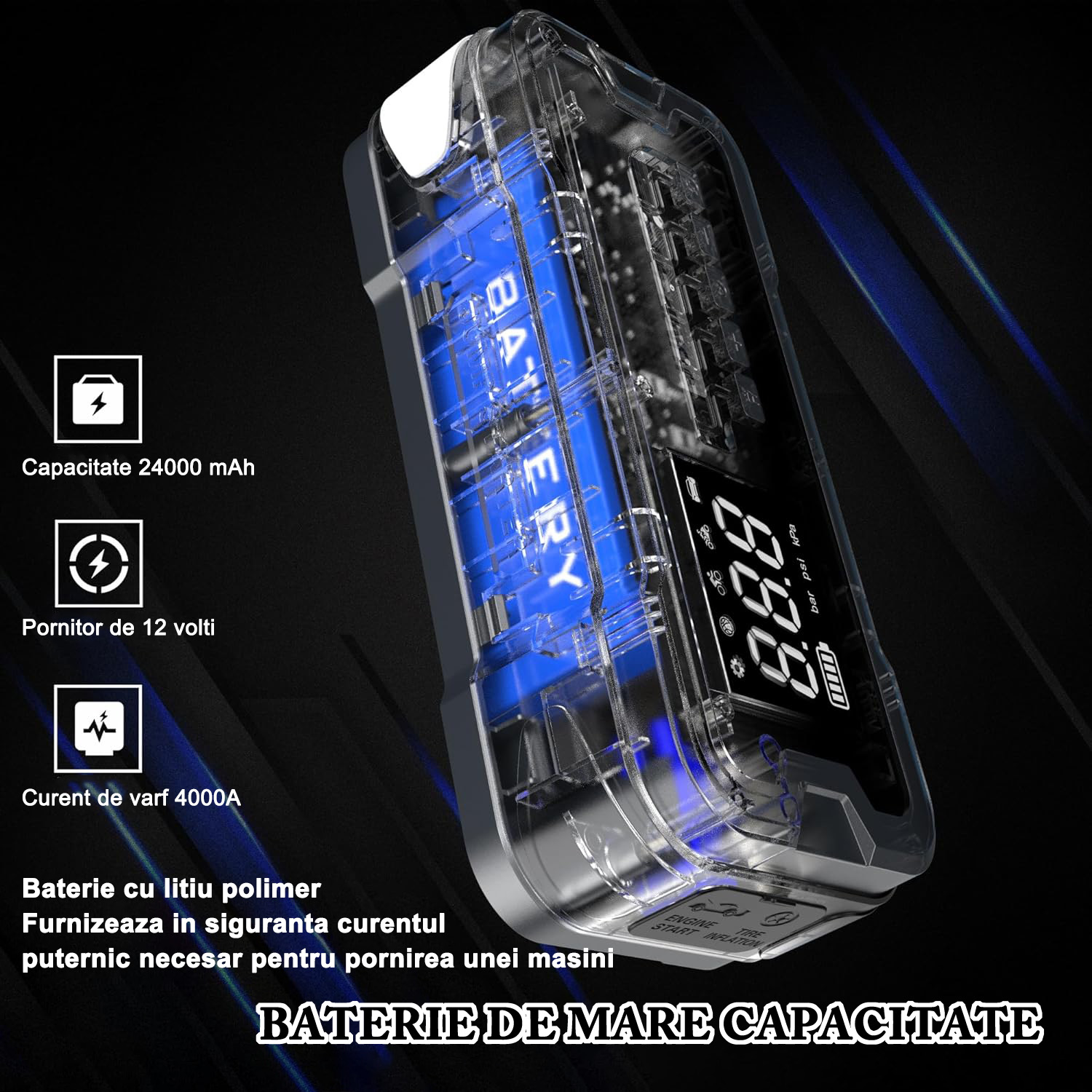 Starter Auto, BYONDSELF®, 4 in 1, 4000A, 12V, 24000mAh, Baterie Externa/Compresor de Aer Functie, Ecran Digital, 3 Moduri de Lumina LED, Protectie Inteligenta, Portabil, Pentru 5.0L Motor Benzina/4.0L Diesel, Negru