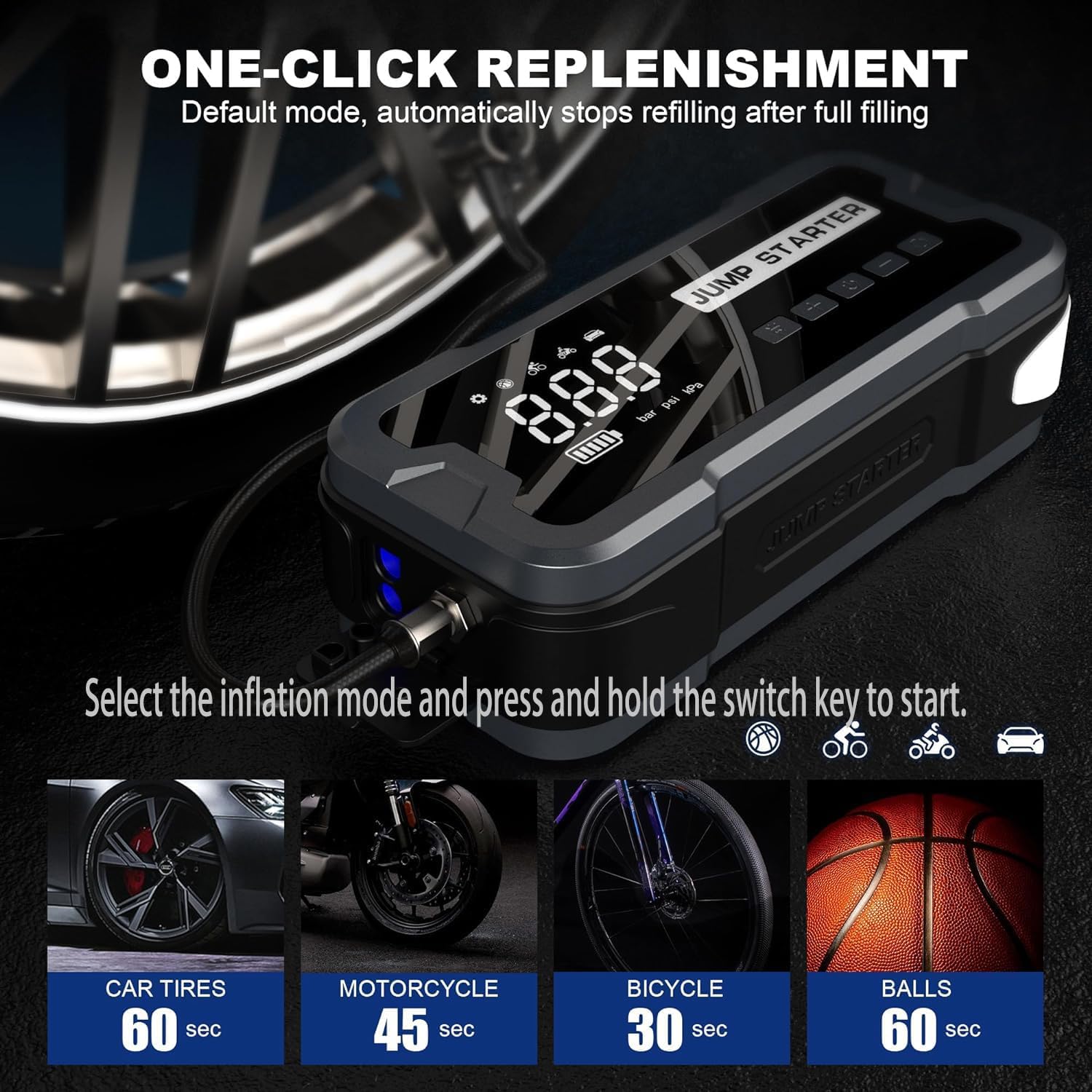 【Sursa de Pornire de Urgenta 4000A】Starter auto 4 in 1 pentru masina cu compresor de aer poate porni de urgenta majoritatea vehiculelor de 12 V, Potrivit pentru masini cu pentru 5.0L motor benzina/4.0L diesel, Atunci cand masina dvs. se Defecteaza pe drum,Poate porni intr-un timp scurt bateria interna va genera un curent de varf de pana la 4000A pentru a va trezi motorul defect fortati masina sa reporneasca, Incarcand pana la Poate fi pornit de 30 de ori, Potrivit pentru masini de 12 V, Motociclete, Barci, ATV-uri, UTV-uri, SUV-uri, Barci etc, Potrivit pentru calatoriile si urgentele dvs 【Sursa de Alimentare Mobila de Mare Capacitate 24000mAh】Starter auto multifunctional nu este doar un pachet de baterii de pornire de urgenta, Este un starter auto portabil cu o baterie de 24000 mAh, Este echipat cu 1 port de iesire de tip C si 2 iesiri USB de incarcare rapida 5V/2A QC3.0,Porturi , Ceea ce il face un incarcator portabil ideal pentru diverse dispozitive, Cum ar fi telefoane, Tablete si MacBook-uri, Trebuie doar sa porniti comutatorul ON/OFF, sa Faceti clic pe butonul de pornire si sa conectati cablul USB,Dimensiunea demarorului auto este de 20,9×9×6CM,Ceea ce este convenabil pentru transportul zilnic 【Afisaj Digital Compresor de Aer Fara Fir】Starter auto portabil cu afisaj LCD are un afisaj LED foarte mare si un design intuitiv,Setarea presiunii pentru a evita presiunea excesiva ,Starter auto multifunctional portabil are 3 tipuri de duze de aer care pot fi inlocuite la nevoie, Este potrivit pentru Masini motociclete, Biciclete,Iar modul de umflare poate fi reglat in orice moment in timpul procesului de umflare, Poate fi folosit si in mod normal in medii extreme (-10°), Oferindu-va liniste sufleteasca 【3 Moduri de Iluminare LED de Urgenta】Starter auto multifunctional de urgenta este, de Asemenea, Echipat cu lumina de urgenta LED, Care ofera 3 moduri de iluminare (Normal, Stroboscopic, SOS) in intuneric si situatii de urgenta si accepta 48 de ore de iluminare de inalta luminozitate,Aparatul are diverse protectii precum suprasarcina, Supracurent, Scurtcircuit, Conexiune inversa, Antiscantei,Incarcare inversa, etc, Permitandu-ti sa pornesti masina usor si rapid 【Tehnologie de Utilizare Ultra Sigura】Acest starter auto portabil de masina are mai mult de 10 protectii, Supraincarcare, Supracurent, Scurtcircuit, Conexiune inversa, Temperatura scazuta, Temperatura ridicata, Supratensiune, Suprasarcina, Antiscanteie, Incarcare inversa, permitandu-va sa operati usor si rapid in situatii extreme Porniti masina in conditii ambientale (-10°), Oferindu-va liniste sufleteasca, Chiar si incepatorii pot opera cu incredere |