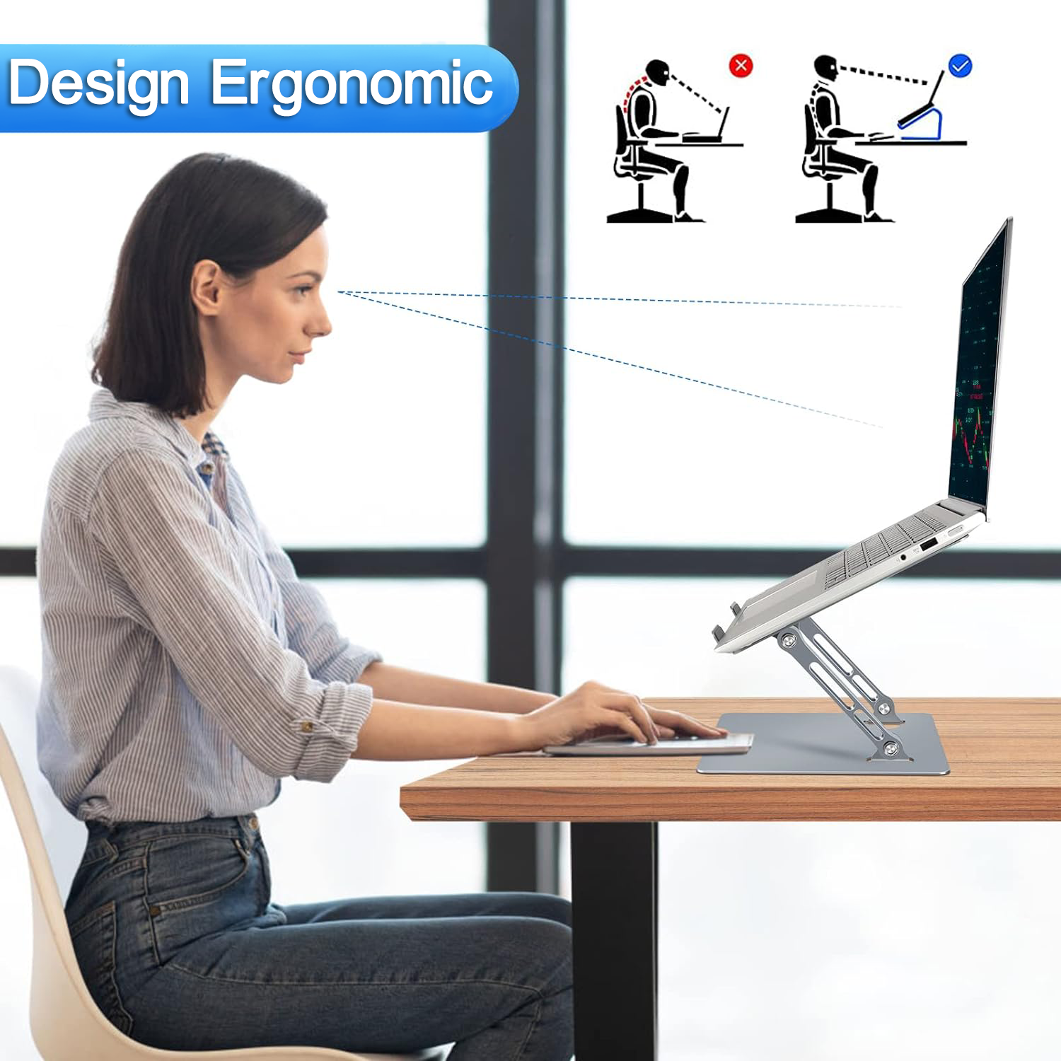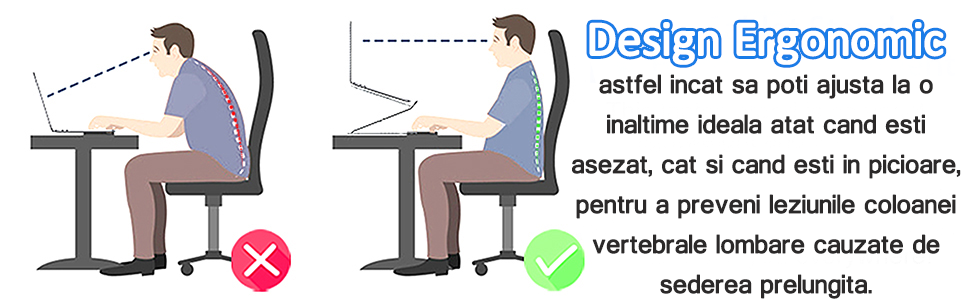 | 【Design ergonomic】: In timp ce lucrezi, ochii tai ar trebui sa fie la 25-40 cm sub partea de sus a ecranului. Suportul poate ridica laptopul la o inaltime intre 3 si 27 de centimetri, astfel incat sa poti ajusta la o inaltime ideala atat cand esti asezat, cat si cand esti in picioare, pentru a preveni leziunile coloanei vertebrale lombare cauzate de sederea prelungita. |