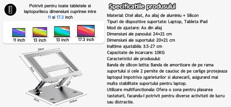 Suportul pentru laptop este compatibil cu toate laptopurile de la 11 la 17,3 inci, cum ar fi Apple MacBook, MacBook Pro, MacBook Air, Powerbook, iPad si laptopurile Asus de la 11 la 17,3 inci, precum si cu modelele Sony, Dell, Toshiba, Lenovo si altele. |