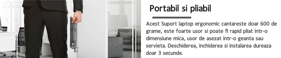 | 【Portabil si pliabil, usor de instalat】: Acest Suport laptop ergonomic cantareste doar 1.2KG, este foarte usor si poate fi rapid pliat intr-o dimensiune mica, usor de asezat intr-o geanta sau servieta. Deschiderea, inchiderea si instalarea dureaza doar 3 secunde. |