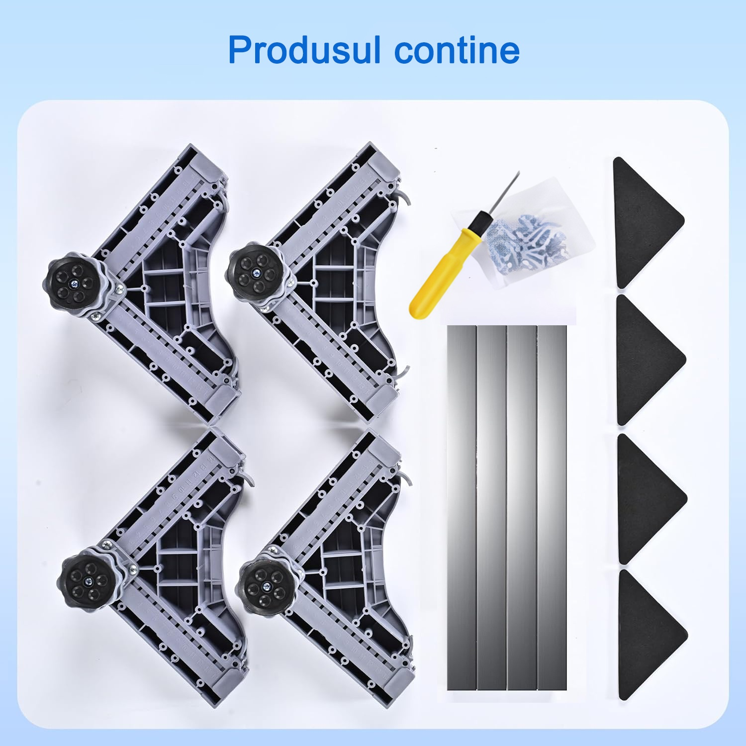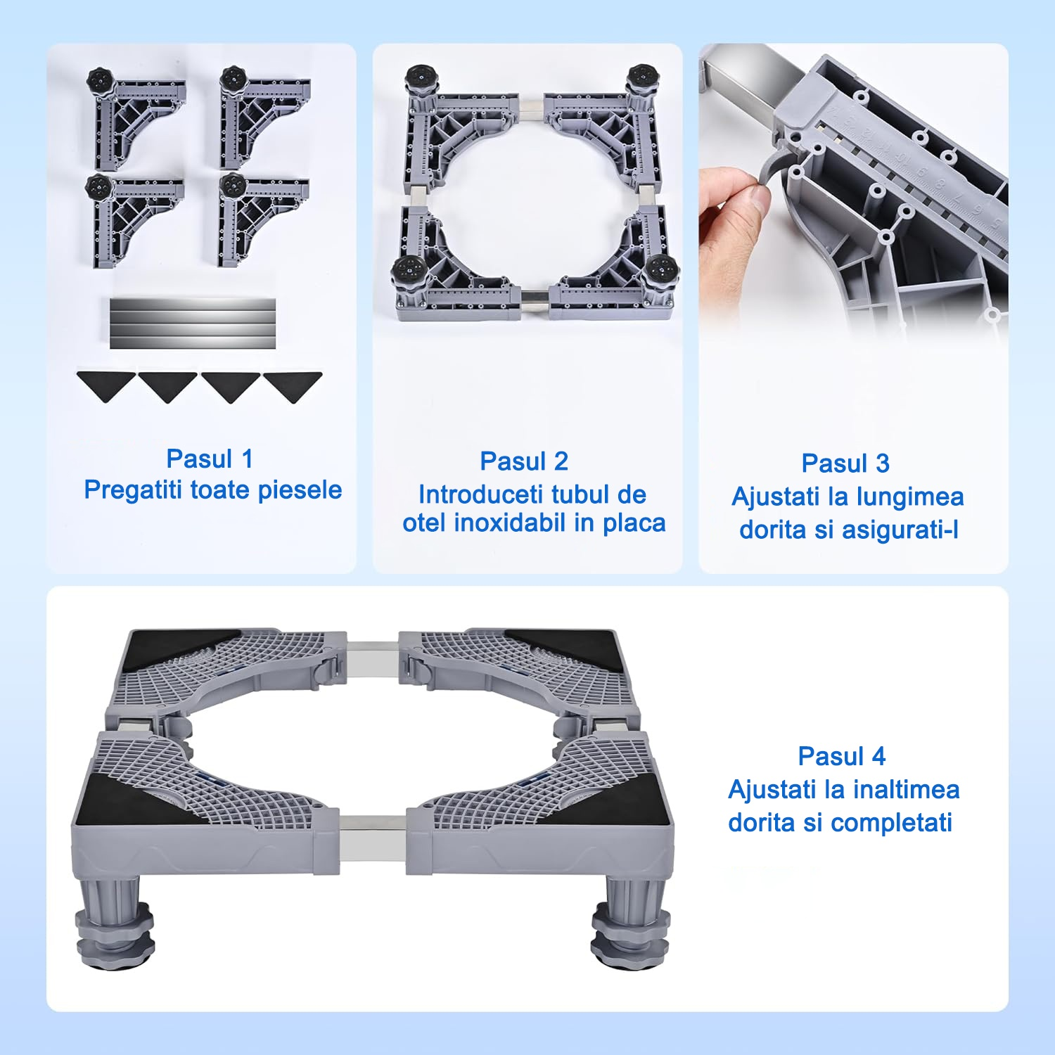 【Usor de asamblat】: Suport Pentru Masina de Spalat/ Frigider/ Aragaz vine cu tije si picioare reglabile din otel, trebuie doar sa instalati 4 biele din otel inoxidabil si 4 picioare fixe (fara roti) pentru a finaliza cu usurinta instalarea, puteti urmari imaginea principala si cea inclusa. Instructiuni de instalare Suport pentru Electrocasnice