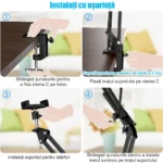 【Economisire spatiu】 Suport pentru telefon poate fi fixat pe marginea mesei si vine cu o lampa circulara si un filet universal de 1/4 inchi care poate fi compatibil cu suporturi pentru telefoane mobile, lumini de umplere, camere si alte dispozitive, poate economisi spatiu si va poate asigura ingrijirea mediului de fotografiere.
