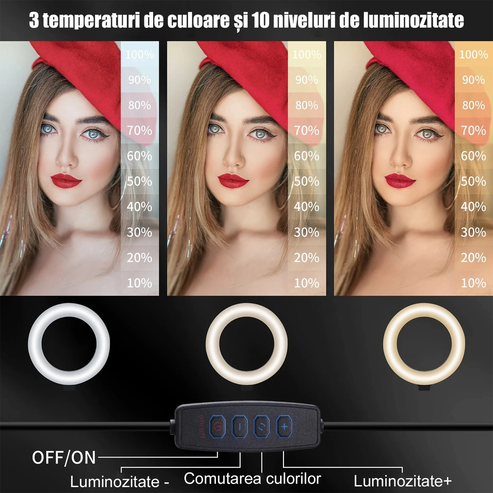 - Inelul luminos de 6 inchi are 3 temperaturi de culoare si fiecare culoare are 10 niveluri de luminozitate ale modurilor de iluminare, permitandu-va sa gasiti cu usurinta cea mai buna iluminare pentru a imbunatati calitatea inregistrarii fotografiilor.
