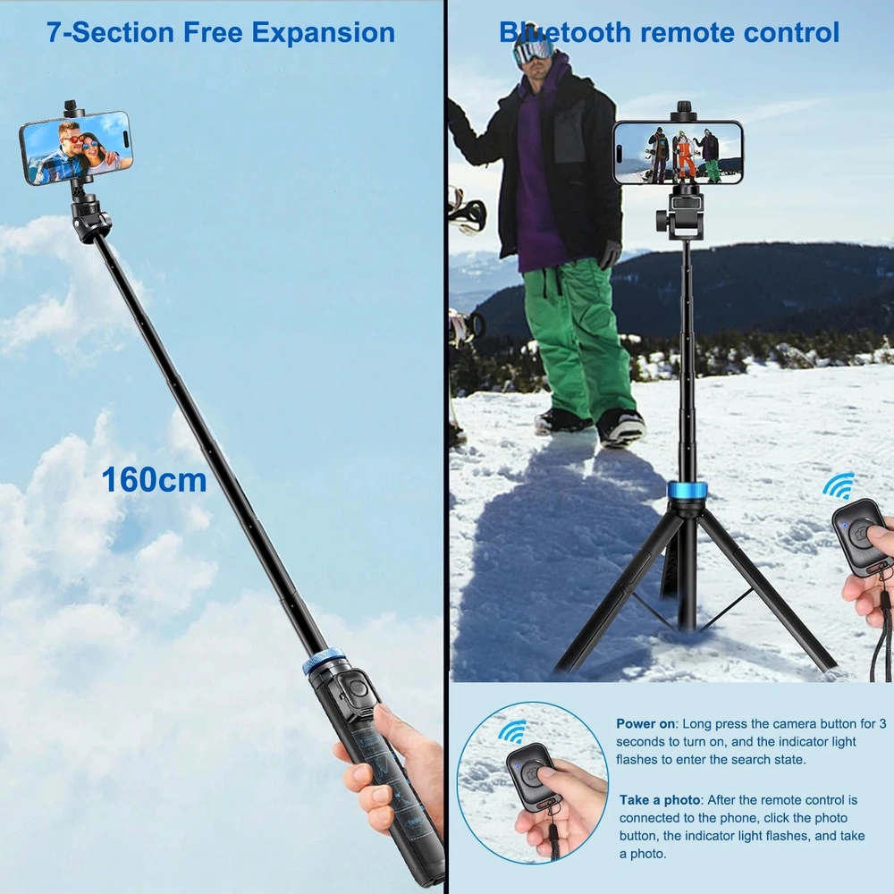 Trepiedul poate fi extins de la 31 cm la 160 cm (suportul pentru telefon este inclus in masurare), facandu-l cel mai lung selfie stick pentru iPhone. Cu inelul magic de blocare si tub telescopic cu 7 sectiuni, il puteti seta la inaltimea dorita in doar 5 secunde. Poate fi folosit si ca trepied de masa, oferindu-va libertatea de a alege unghiul si inaltimea perfecte de fotografiere, de la prim-planuri cu unghi mic pana la fotografii de grup.