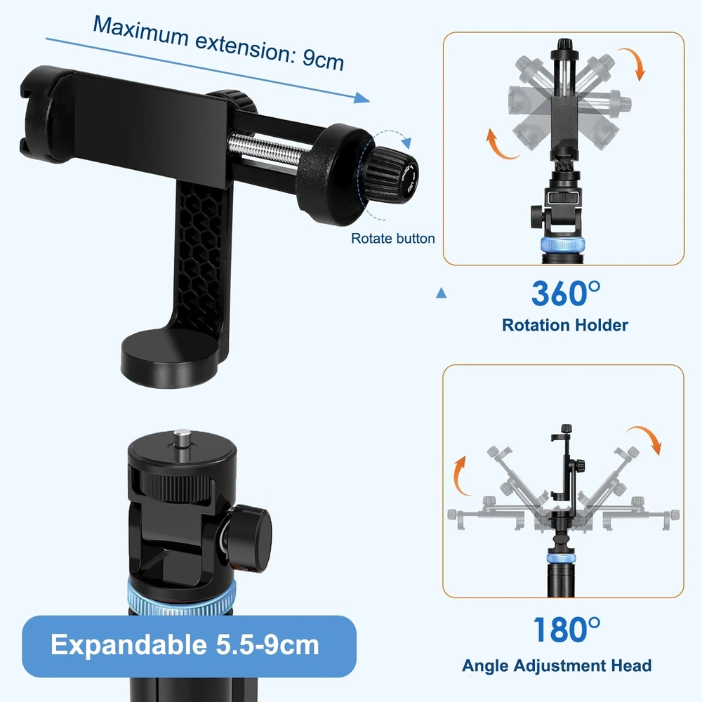 【Suporta toate unghiurile de fotografiere】Gimbalul se poate roti la 180°, iar suportul pentru telefon poate fi ajustat la 360°. Puteti seta liber telefonul la 720° pe acest trepied pentru telefon, astfel incat sa puteti gasi intotdeauna rapid cel mai bun unghi de fotografiere, sa explorati perspective diferite si sa dezlantuiti creativitate nelimitata.