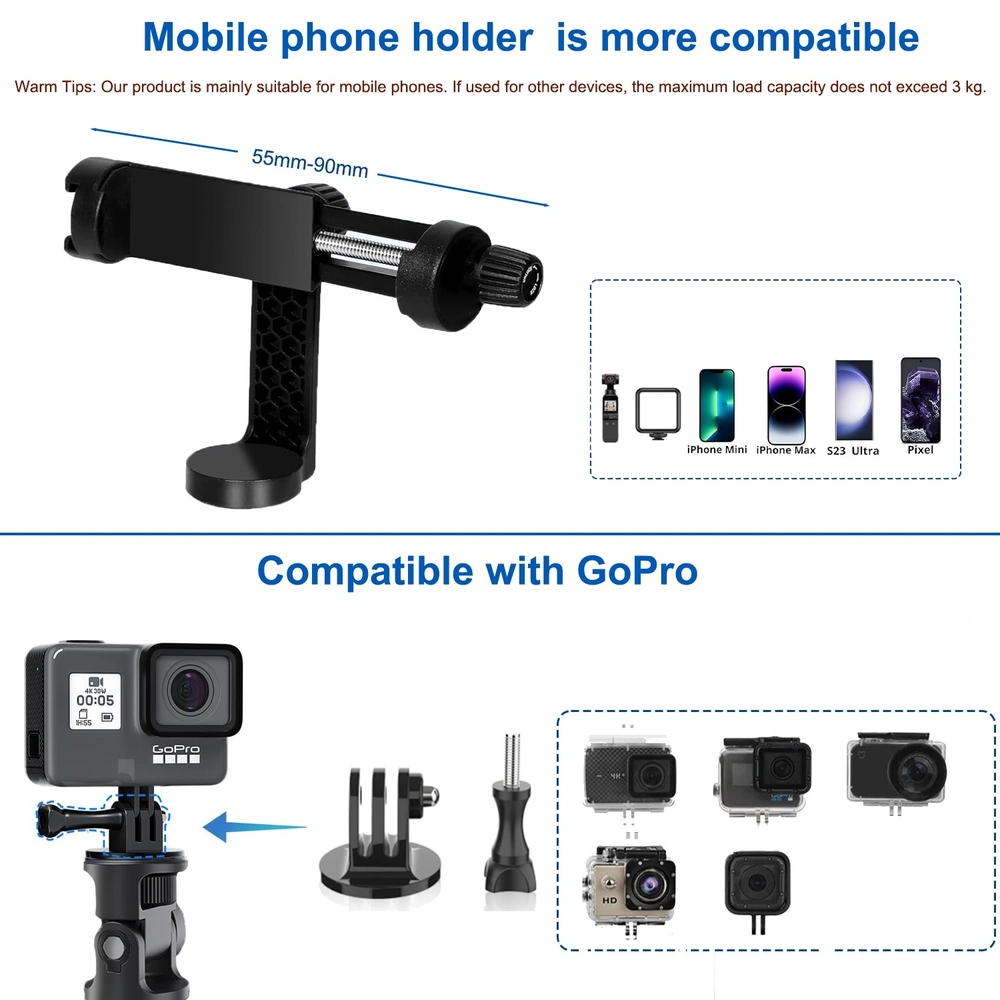 【Suport pentru telefon si adaptor Go Pro】Trepiedul nostru selfie stick este special conceput pentru smartphone-uri si camere de actiune, este un partener ideal pentru a surprinde momente de neuitat. Suportul pentru telefonul mobil inclus poate fi ajustat de la 5,5 cm la 9 cm in dimensiune, care poate gazdui telefoane mobile mari si este potrivit pentru majoritatea telefoanelor mobile. Rasuciti usor butonul din partea de sus pentru a-l deschide. Exista doua placute moi din silicon pentru a proteja telefonul, astfel incat sa nu va faceti griji cu privire la zgarierea suprafetei.