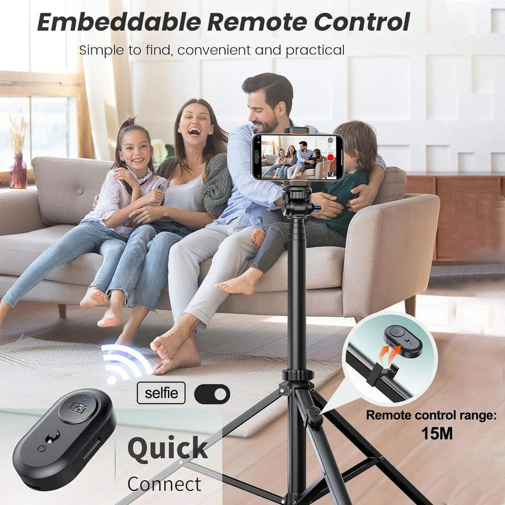Pachetul include tot ce ai nevoie pentru a incepe utilizarea acestui trepied foto telescopic: trepiedul, un suport de telefon extensibil, telecomanda Bluetooth, clipsul pentru telecomanda si o husa de depozitare. Aceste accesorii iti permit sa montezi rapid orice echipament si sa ai totul la indemana pentru o experienta usoara de fotografiere.