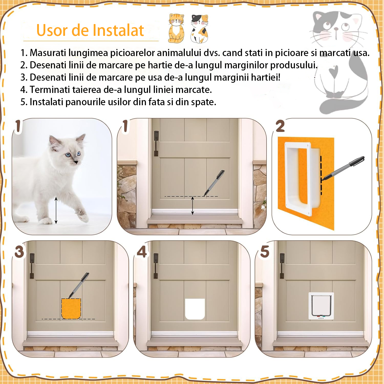 Sfaturi pentru formarea initiala: Se recomanda ca proprietarii de animale de companie sa petreaca cateva zile indrumandu-si cu rabdare animalele de companie pentru a se familiariza cu utilizarea usii batante pentru pisici. Animalele de companie pot fi incurajate sa incerce si sa se adapteze treptat la actiunile de deschidere si inchidere ale usii pisicii prin utilizarea recompenselor (cum ar fi tratarile).