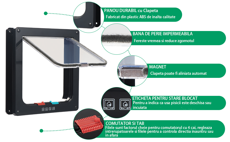 - Corpul principal al usa batanta pentru pisici este realizat din material ABS de inalta calitate, care este impermeabil, rezistent la intemperii si durabil.