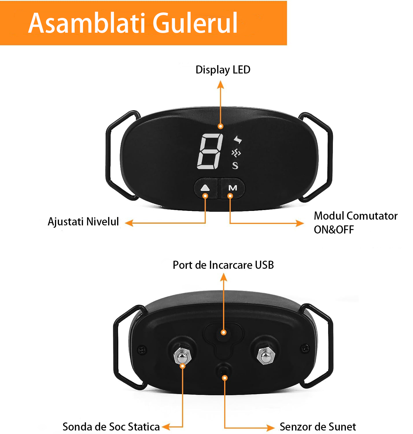1 x Cablu USB Manual de utilizare Dioda testare stimulare electrostatica 1 x Zgarda antilatrat Curea reflectorizanta ajustabila |