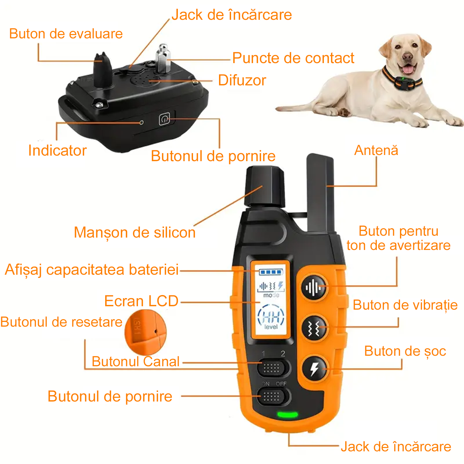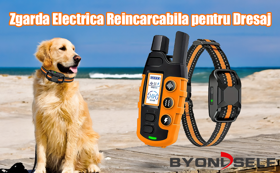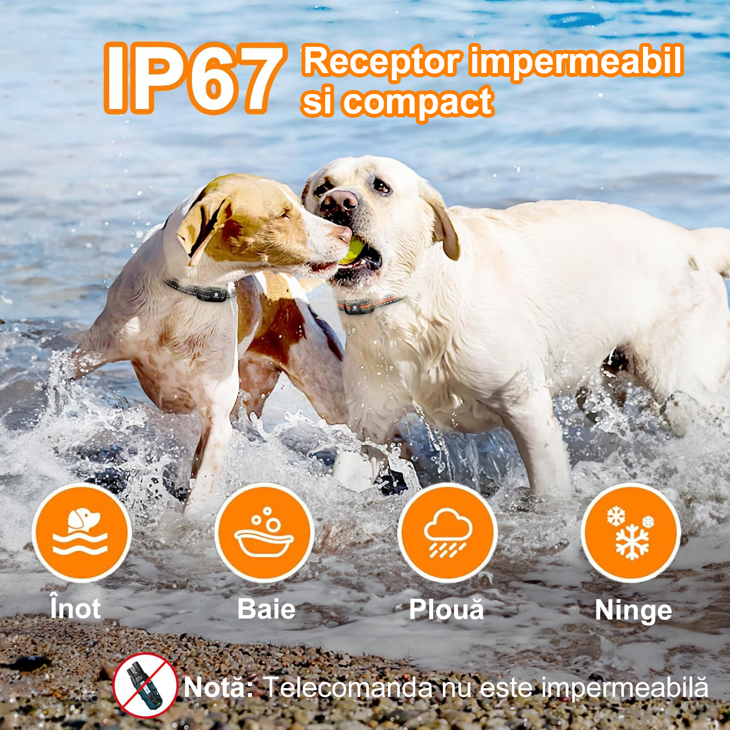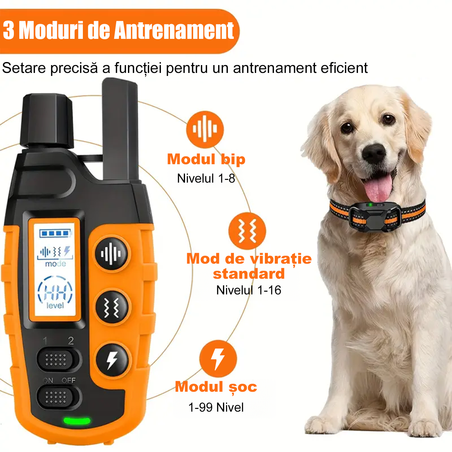 Zgarda Electrica Dresaj Caini, BYONDSELF®, Functie Antilatrat, Rezistenta la Apa si Praf (IP67), 1000m, 3 Moduri de Dresaj, pentru 2 Caini, Reincarcabila, Portocaliu
